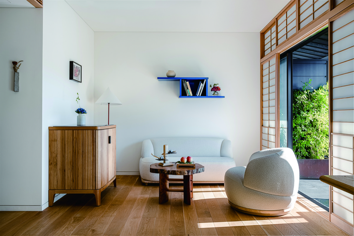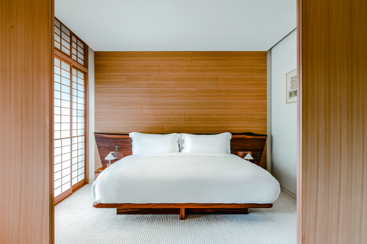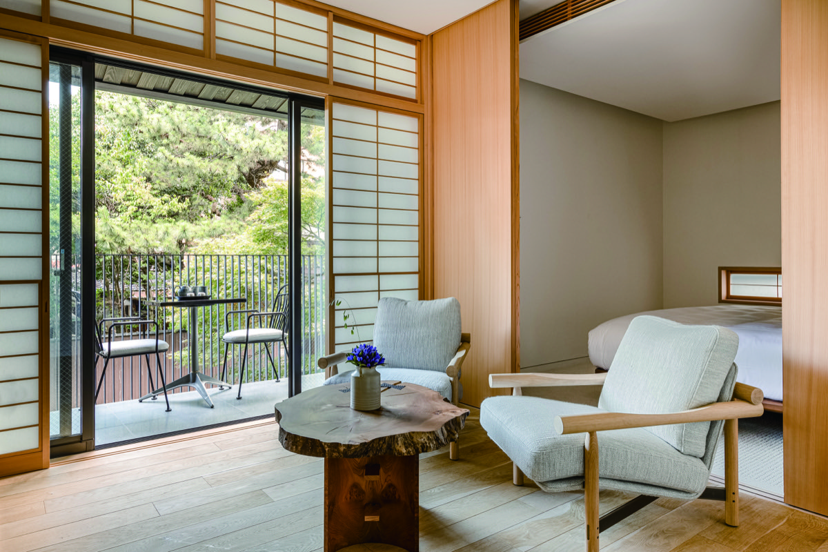 日本の旅館からインスパイアされたという「THE SHINMONZEN」の客室は、4層のフロアにわずか9室。明るく広々とした9つのスイートルームは、テラスから祇園白川を臨み、ヒノキが薫るバスタブ、一枚岩から作られた大きな大理石のカウンター、ベルベットのようにやわらかな畳など、細部までが自然の美しさと共存し、ひときわ魅力的な特製のアートワークが、その美しさをさらに引き立たせる。