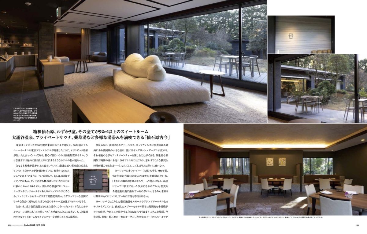 ヨーロッパではこうした宿泊施設をスモールラグジュアリーホテルとカテゴライズしている。前述したメジャーなホテル群とは対照的な小規模がウリの宿だ。今回ここで紹介する「仙石原古今」はまさにそんな場所。今年2月、箱根・仙石原の一角にオープンした全室スイートのスモールラグジュアリーホテルである。