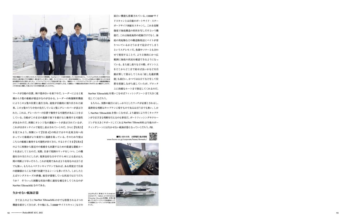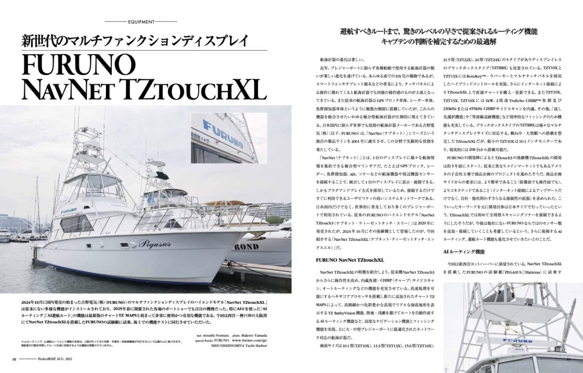 もちろん、実際の航行にはしっかりとしたワッチが必要とされるし、最終的な判断はキャプテンに帰すものであるは言うまでも無い。しかしNavNet TZtouch XLを使いこなせば、より適切により早くキャプテンがさまざまな判断を行えるのも事実だ。ボートフィッシングやクルージングを大きくサポートしてくれるNavNet TZtouch XLは今後のボーティングシーンには欠かせない航海計器となっていくだろう。P.B.