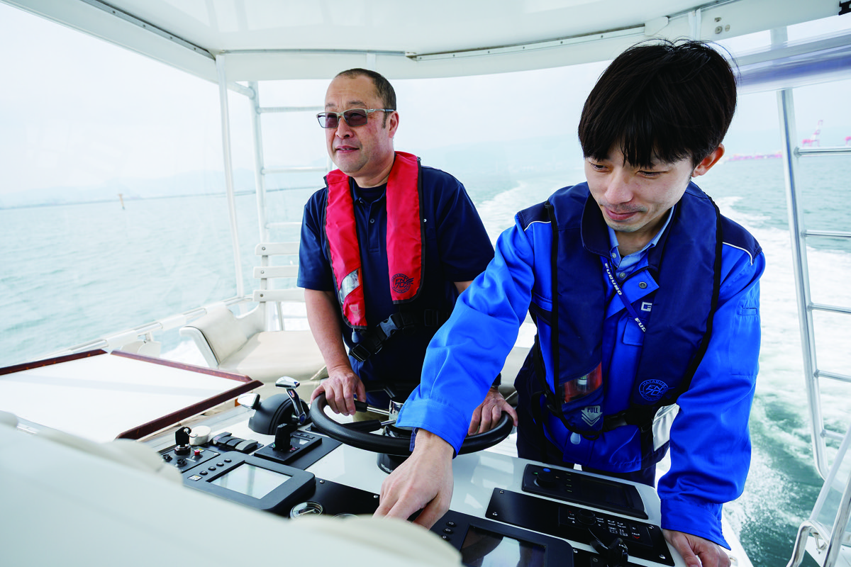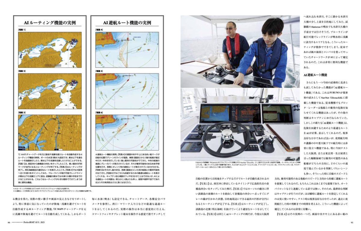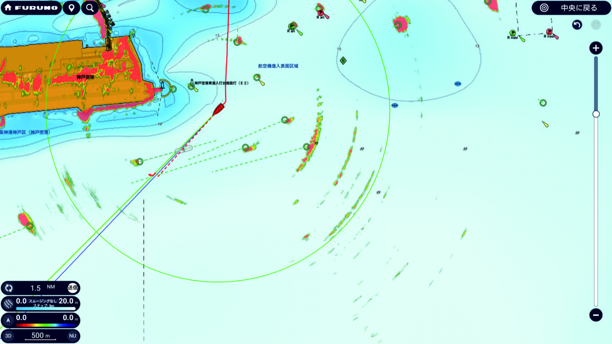 今回は新西宮ヨットハーバーに係留されている、NavNet TZtouch XLを搭載したFURUNOの試験艇「PEGASUS」(Hatteras)に試乗する機会を得た。実際の使い勝手や画面の見え方などをリポートしよう。特に事前に気になっていたのが陸地・浅瀬を避けてルートを自動作成するAIルーティング機能。TZMAPSチャートデータを元に浅瀬や陸地を避けてルートを自動生成してくれる。しかもボート毎に水深(喫水)も設定できる。チャートデータ、各種安全パラメータを参照し、湾口・マリーナ入り口などの最適な通過ルートを示してくれるのだ。実際の操作は本当に感覚的に行える。スマートフォンやタブレット端末を操作する感覚で指でタッチして自船の位置から目的地をタップするだけでルートが自動生成されるのだ。【写真1】は、西宮沖に停泊しているタイミングで広島県呉市の倉橋島沖合いをタップしてみた例だ。【写真1】ではカーソルの動きに伴い淡路島の南側のルートを経由して倉橋島の沖合いへまっすぐにグレーの線が引かれた状態。目的地周辺にできる扇状の円形が全円になるとルーティングが完了する。【写真2】はルーティングが完了し、淡路島の北側(明石海峡)を抜けていくより適切なルートを示してくれている。【写真3】は同じくAIルーティングの例だが、今度は大阪湾へ流れ込む木津川、そこに掛かる木津川大橋の少し上流を目的地にしてみた。試験艇のHatterasの喫水でも木津川大橋の手前までは行けそうだ。ブルーラインが航行可能でレッドラインが喫水的に浅瀬に該当するエリアとなる。こういったルーティングが数秒でできてしまう。従来であれば紙の海図とコンパスを使ってやっていたチャートワークがAIによって補完されるのだ。これは非常に便利な機能である。