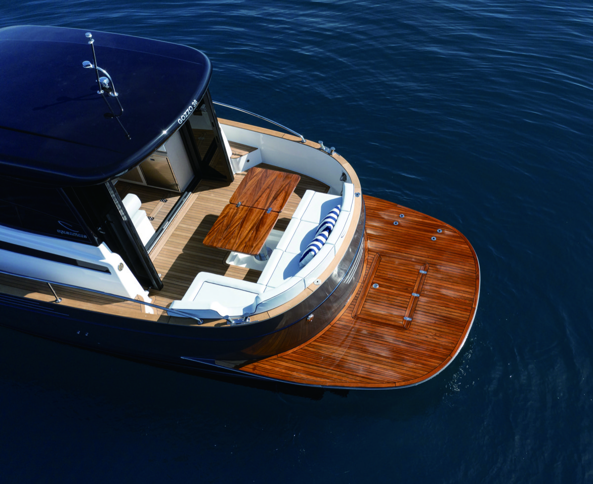 新しいGozzo38Cabinは、Gozzo35と同じ船体を共有している。見た目こそGozzo35にキャビンを載せ、スイムプラットフォームを延長したように見えるが、デッキのデザインは、全く違うボートと言っていいほど設計から練り直され、ゼロベースで作り上げられている。クラシカルなゴッツォ・ソレンティーノのデザインを損ねる事なく、スペースを最大化した難しい設計。それを成功させたキャビンモデルが、Gozzo38Cabinなのだ。