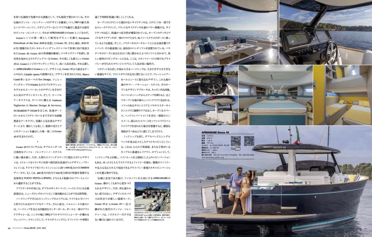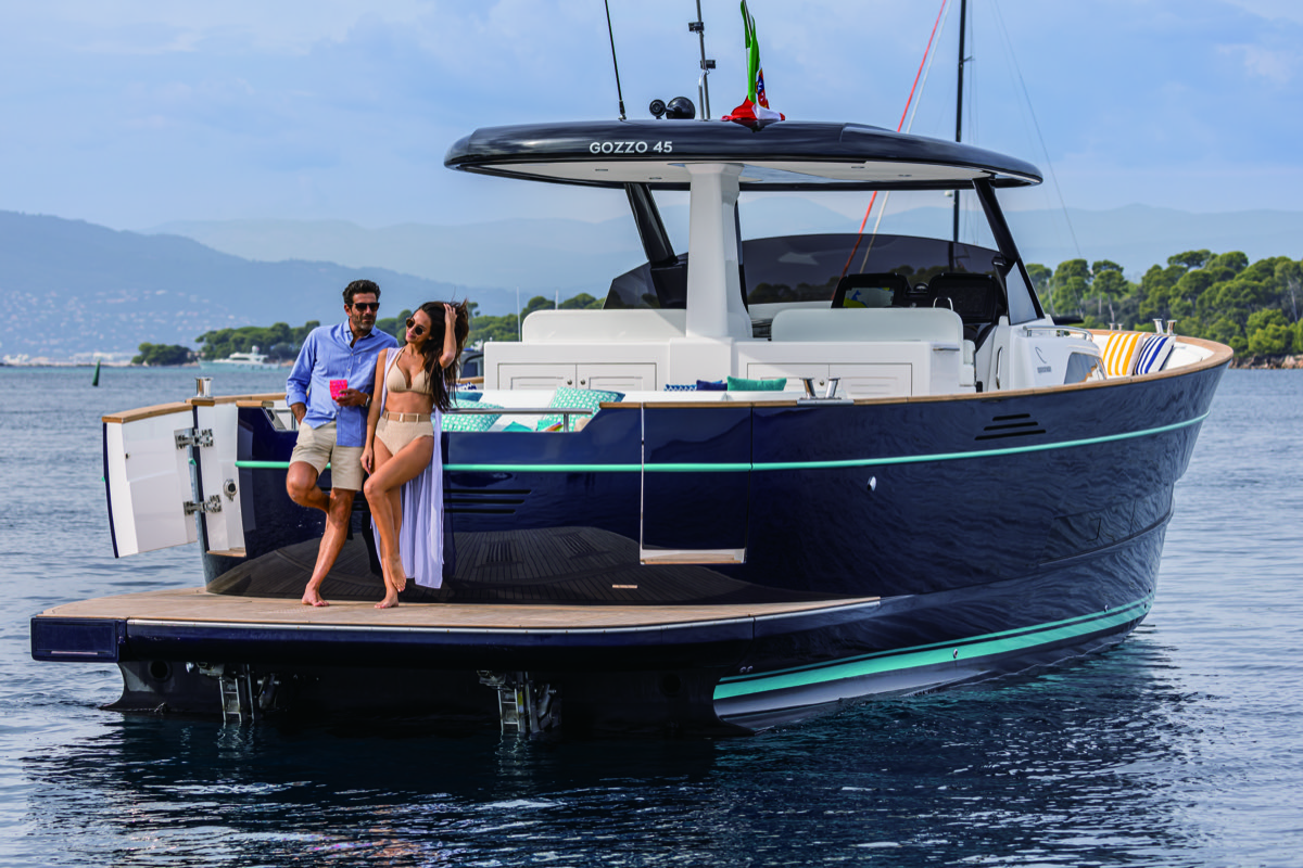 Gozzoレンジの第一弾として鮮烈なデビューを飾り、EuropeanPowerboatoftheYear2018を受賞したGozzo35。それに続き、2022年9月に開催されたカンヌヨッティングフェスティバルで世界に向け発表されたGozzo45。Gozzo35の世界観を継承しつつサイズアップを図り、居住性を高めたよりラグジュアリーなGozzo。その美しくも愛らしいGozzo45は、Gozzoレンジのフラッグシップとして、高い人気を誇る。それは新しいAPREAMAREのGozzoレンジ。デザインは、Gozzo35から始まるチームのもの。CataldoApreaの指揮のもと、デザインを任されたのは、MarcoCasali率いるローマのTooDesign。フェレッティグループのITAMAなどのプロダクションモデルからスーパーヨットのデザインを手がける人気のデザインオフィス。そして、ナーバルアーキテクトは、ラパッロに構えるUmbertoTagliaviniのMarineDesign&Services。NUMARINEやOTAMをはじめ、高速ボートのハルからミリタリーのハルまで手がける経験豊富なアーキテクト。実績と人気を誇るデザイナーにより、懐かしくも美しく、最新の走りとアコモデーションを融合した唯一無二のGozzo45が生まれたのだ。