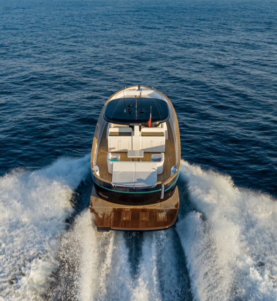 Gozzo45のトランサムは、ダブルエンダーの古典的なゴッツォ・ソレンティーノ・スタイルに倣い弧を描く。だが、大型のスイミングステップに隠れたボトムデザインは、ストレートなトランサムを持つ現代的な高速ボトムデザイン。パワートレインは、Vドライブをトランスミッションに持つ600馬力のCUMMINSディーゼル。もしくは、480馬力の出力で650馬力相当の性能を発揮する高効率なVOLVOPENTAのIPS650。どちらも2基掛けのパワートレインから選択することができる。