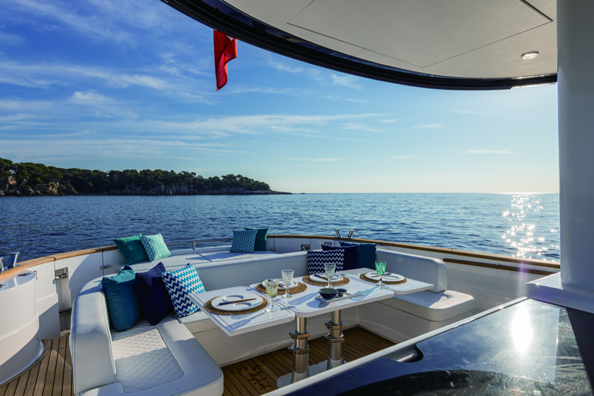 ハードトップで守られたミッドシップのエリアには、ワイドなU字ソファと折りたたみ式のワイドなテーブル。さらに前方、ヘルムシートの後ろには、ハードトップを支える印象的なセンターポール。ポールと一体のアウトドアギャレーは、シンクの他にBBQグリルやリフリジェレーターが備わるウェットバー。ラウンジとして、テラスダイニングとしてファミリーや仲間と過ごす時間を快適に楽しくしてくれる。