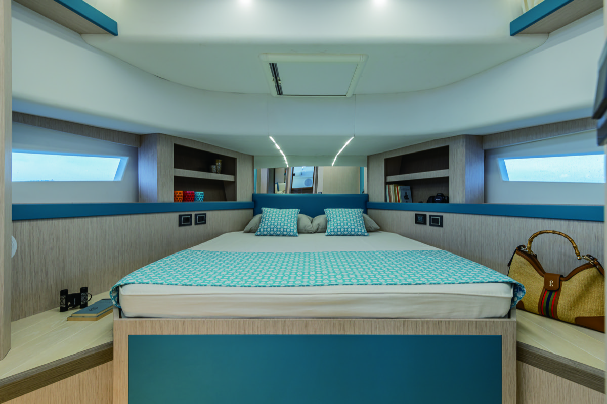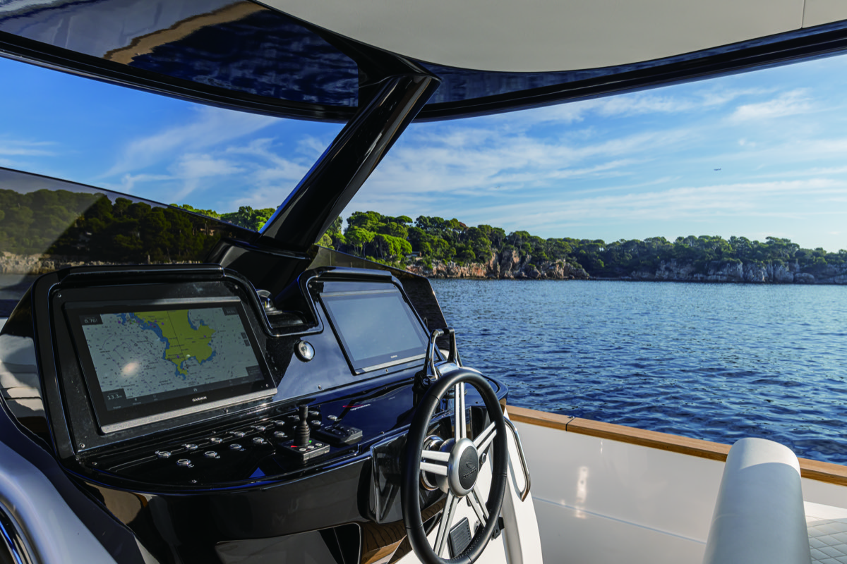 コクピットを日差しや雨から守るハードトップは、大きすぎず小さすぎない最適なサイズ。フロントガラスを完全に閉じないことで、フレッシュエアーをヘルムシートに取り込むデザイン。これも地中海のサマー・バケーション・スタイル。そのオープンなデザインアプローチは、キャビン内も同様。コンパニオンハッチからステップを降りると、広くてオープンな地中海らしいインテリアに包まれる。ソファのあるサロンエリアとバウのマスターキャビンエリアに隔壁やドアはなく、オープンなスペース。ヘッドコンパートメントを含む一部屋のエンスイート。限られたスペースをソファエリアとベッドエリアで仕切られた場合を想像すると、窮屈な部屋が2つあるように感じてしまうだろう。