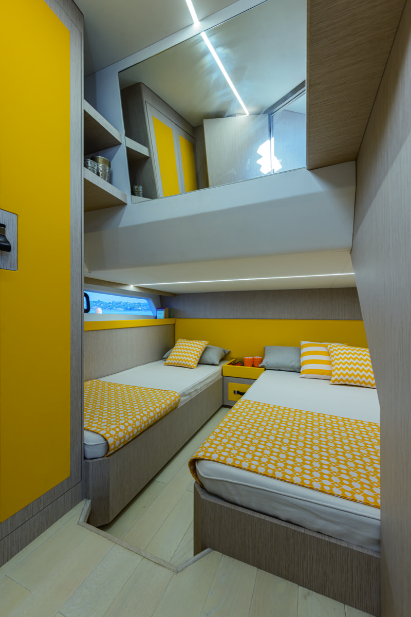ミッドシップも同じ、ダブルベッドとシングルベッドが並ぶ広々としたゲストキャビンとしている。これは、3人の子供部屋、または子供がいるカップルに最適なレイアウト。オプションとして、ミッドシップを2分割し、ツインルームを2部屋にした3キャビンバージョンもある。ゆったりと5人でステイする1ファミリー仕様か、複数のファミリーや友人も交えた6人で宿泊できるプライバシー重視の3キャビンバージョンかを選ぶ事ができる。