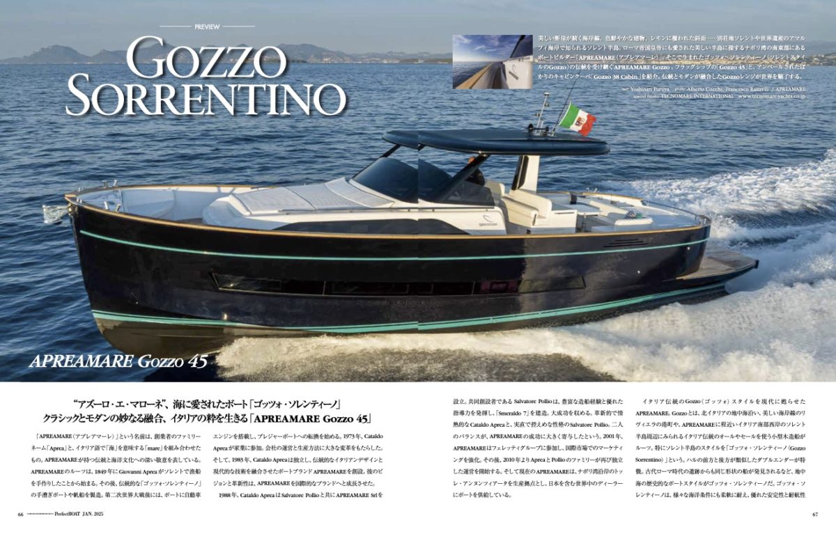 美しい断崖が続く海岸線、色鮮やかな建物、レモンに覆われた斜面……別荘地ソレントや世界遺産のアマルフィ海岸で知られるソレント半島。ローマ帝国皇帝にも愛された美しい半島に接するナポリ湾の南東部にあるボートビルダー「APREAMARE(アプレアマーレ)」。そこで生まれたゴッツォ・ソレンティーノ(ソレントスタイルのGozzo)の伝統を受け継ぐAPREAMAREGozzo。フラッグシップの「Gozzo45」を紹介。伝統とモダンが融合したGozzoレンジが世界を魅了する。