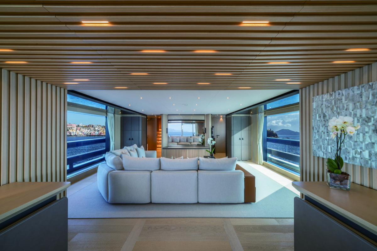 アッパーサロンは、ガラス張りの楽園のような素晴らしい空間である。ゲストが集い、交流したり、食事をしたり、あるいはただくつろいだりしながら、広大な水平線の景色を堪能できるはずだ。インテリアデザインは、現代的なエレガンスと温かみのある居心地の良い調度品が融合し、リラックスした贅沢な雰囲気を醸し出している。“BABBO”は、美しく整えられた6つのキャビンに最大12名まで宿泊可能だ。メインデッキには、広々とした空間、プライバシー、そして豪華なアメニティを備えた4つの同サイズのスイートキャビンがある。ロアーデッキにはツインキャビンがあり、残りのゲストのための快適な空間を提供してくれる。