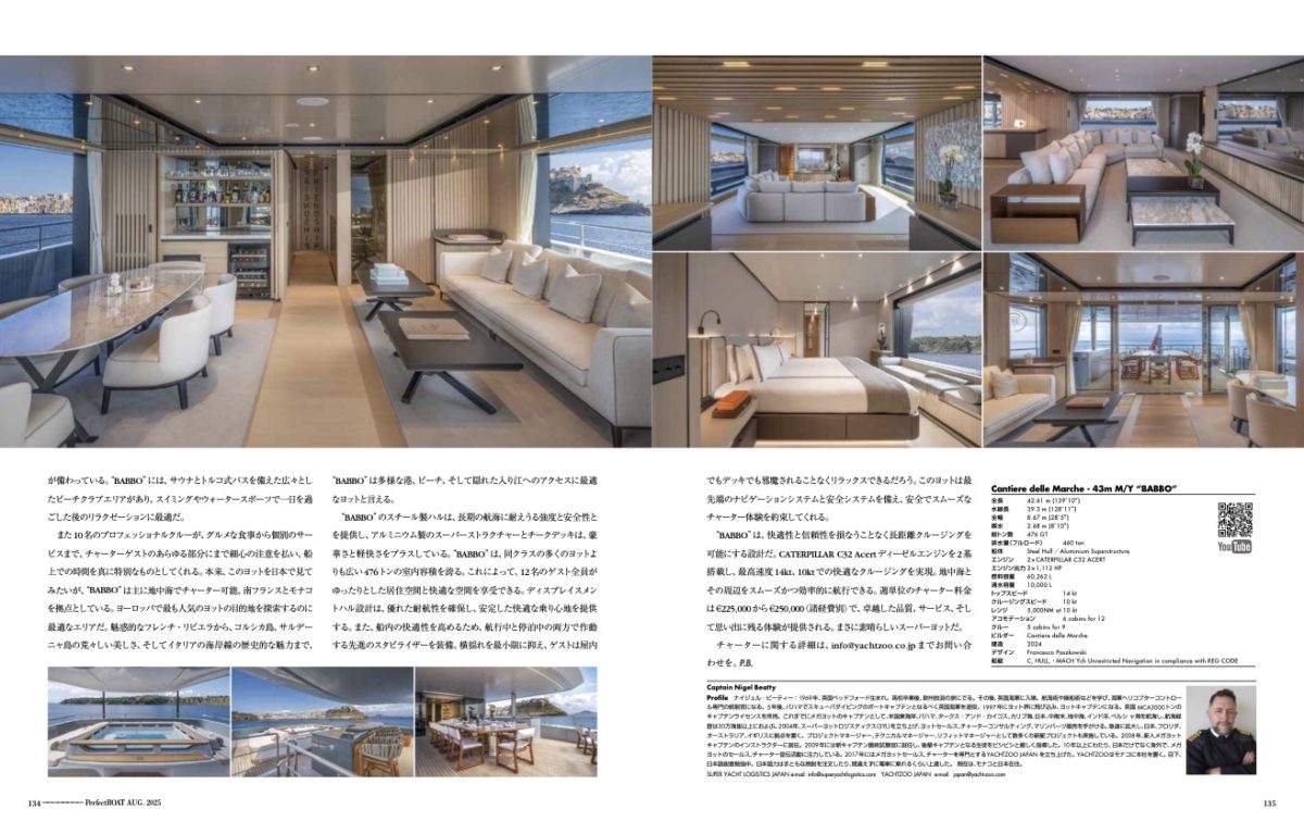 また10名のプロフェッショナルクルーが、グルメな食事から個別のサービスまで、チャーターゲストのあらゆる部分にまで細心の注意を払い、船上での時間を真に特別なものとしてくれる。本来、このヨットを日本で見てみたいが、“BABBO”は主に地中海でチャーター可能、南フランスとモナコを拠点としている。ヨーロッパで最も人気のヨットの目的地を探索するのに最適なエリアだ。魅惑的なフレンチ・リビエラから、コルシカ島、サルデーニャ島の荒々しい美しさ、そしてイタリアの海岸線の歴史的な魅力まで、“BABBO”は多様な港、ビーチ、そして隠れた入り江へのアクセスに最適なヨットと言える。