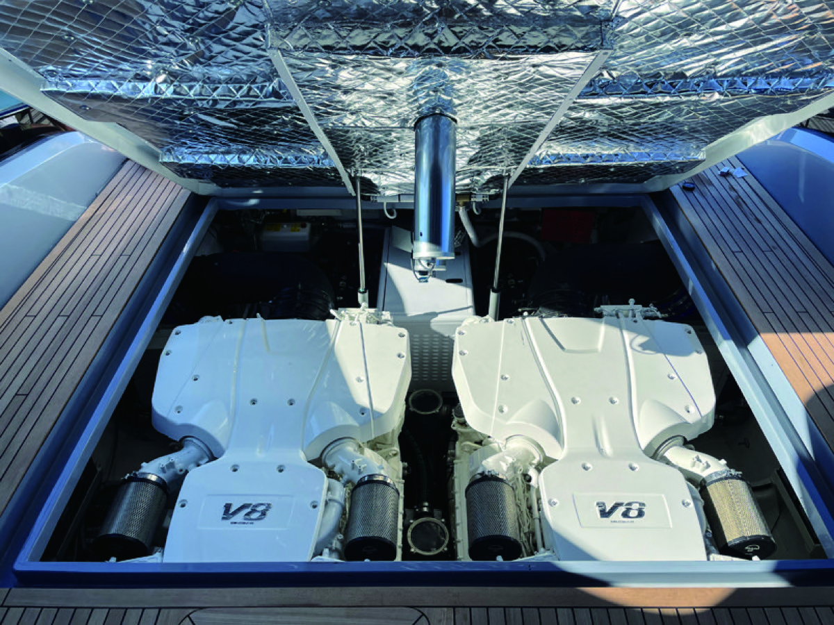 Vespro最大の特徴は、そのスポーツ性能。船体はビニルスター樹脂とPVCフォームコアをカーボンとグラスファイバーでハイブリッドサンドウィッチ。軽量構造の高速ハルに1,200馬力のMAN8Vを2基搭載。パワートレインにはMJP350Xウォータージェットを組み合わせ、クルーズスピード50ノット、トップスピードは56ノットを実現。また、350マイルのレンジを持ち、リビエラのどの港からでもサルディーニャまで無給油でクルーズすることができるスペックに設計されている。P.B.