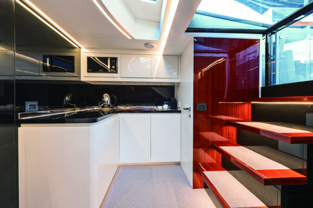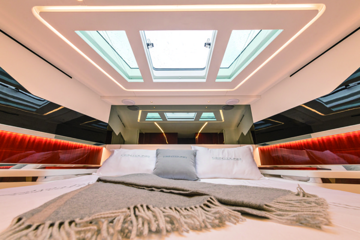 ウィークエンダーと言えども、キャビンも広く、美しくデザインされている。コンパニオンウェイを降りると、スターボードには、ギャレー。ポートサイドには、L字のソファ。ストレートでシャープなアウトラインにスーパーホワイトとブラックを基調に、赤みのあるグロス仕上げのウッドが輝くモダンインテリア。バウキャビンがマスターステートルーム。ミッドシップにはツインのVIPルームが用意され、間接照明の演出と「CENTOUNO」のロゴが入るクッションやリネンがオーナーやゲストをもてなしてくれる。