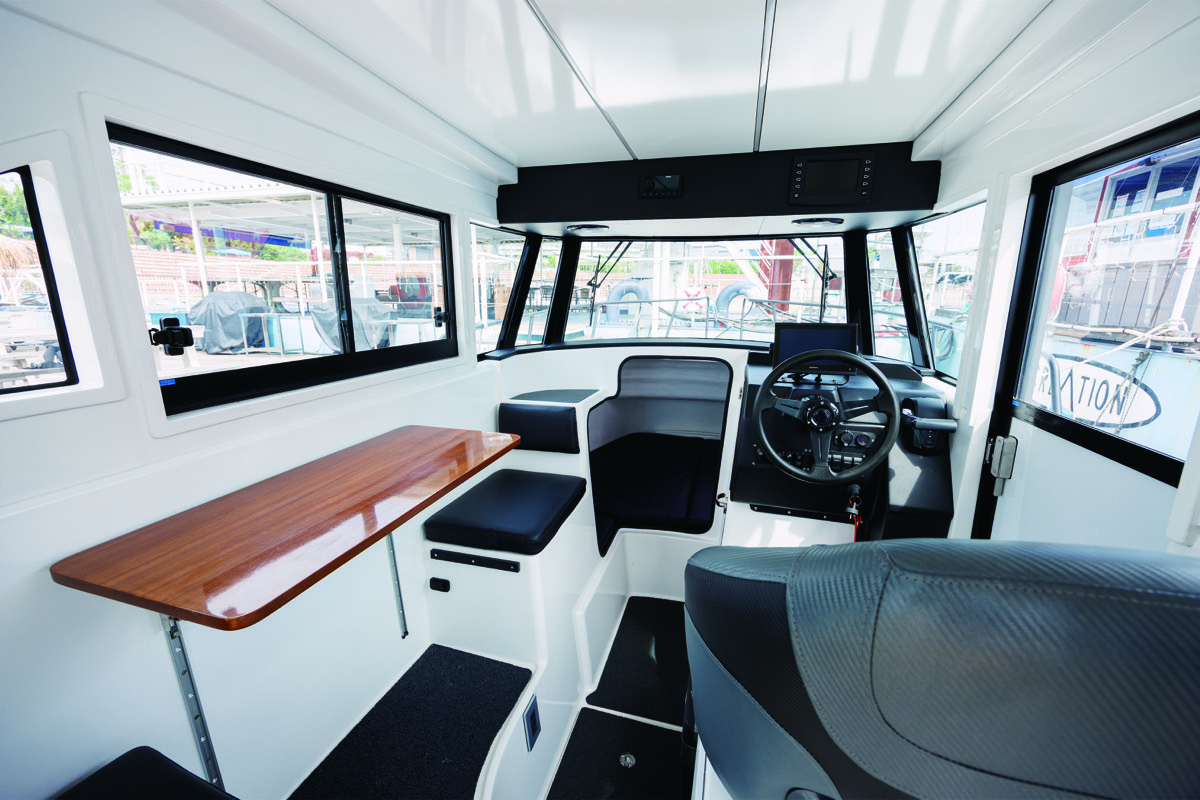 アフトコクピットからスライドドアを開けてパイロットハウスへ入る。ホワイトを基調に、シート類やヘルムステーションはブラックで、全体にモノトーンの色調。左舷に折り畳み式テーブルを配したダイネッティ。右舷にはシンクが備わり、その前にドライバーズシートとヘルムステーションが配置されている。ドライバーズシートの右にはスターボードサイドドアがあり、非常に使い勝手が良い。離岸着岸時はもちろんのこと、ブルワークトップに艤装を施せばキャプテンがいわゆる「手前船頭」でフィッシングも愉しめるだろう。このあたりのレイアウトは日本でプロデュースされたC28ならではと言ったところだ。またヘルムステーション左からフォアのカディスペースにアクセスできる。個室ヘッドも備わっており、簡易な仮眠スペースとしても大型ドライストレージとしても使用できるだろう。