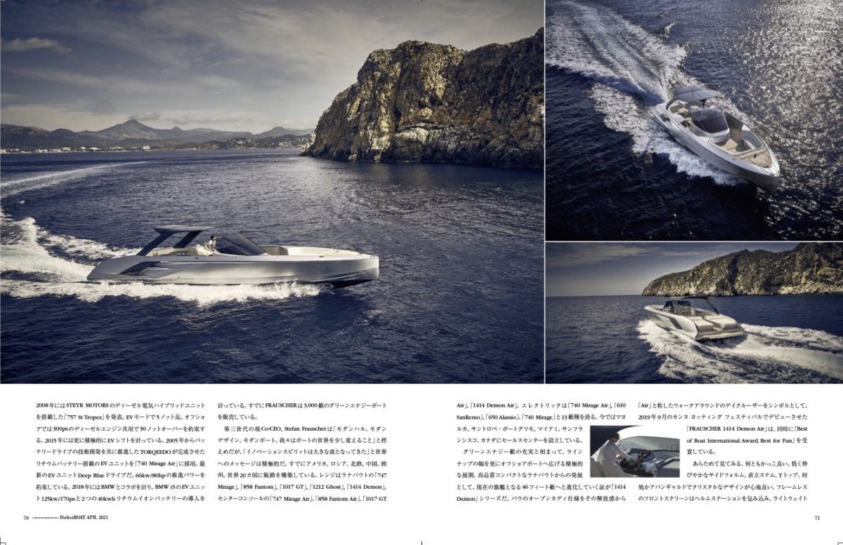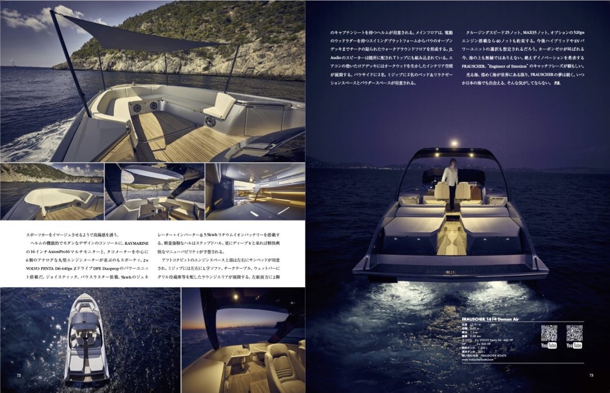 グリーンエナジー艇の充実と相まって、ラインナップの幅を更にオフショアボートへ広げる積極的な展開。高品質コンパクトなラナバウトからの発展として、現在の旗艦となる46フィート艇へと進化していく証が「1414Demon」シリーズだ。バウのオープンカディ仕様をその解放感から「Air」と称したウォークアラウンドのデイクルーザーをシンボルとして、2019年9月のカンヌヨッティングフェスティバルでデビューさせた「FRAUSCHER 1414 Demon Air」は、同時に「Best of Boat International Award,Best for Fun」を受賞している。