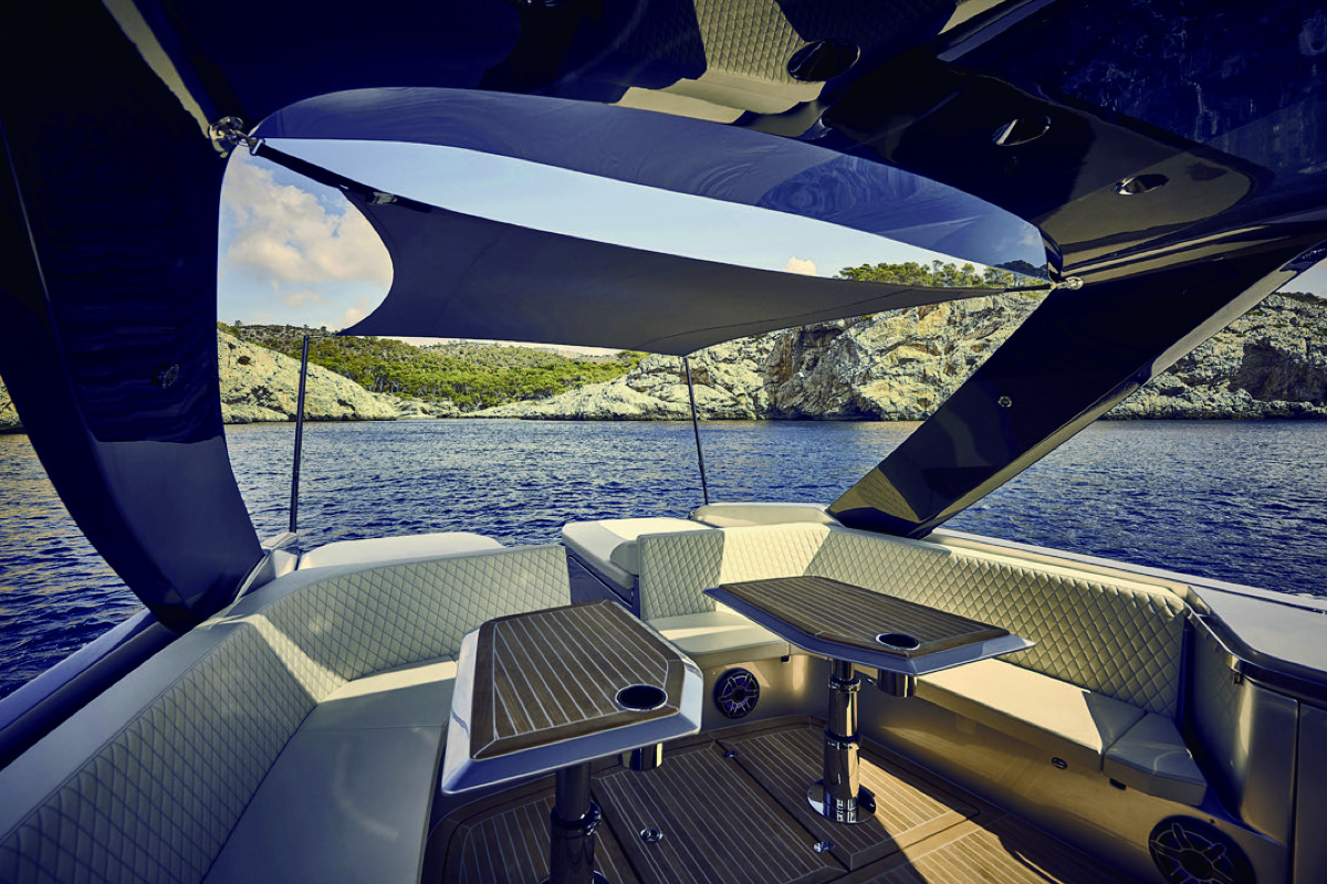 アフトコクピットのエンジンスペース上部は左右にサンベッドが用意され、ミジップには左右にL字ソファ、チークテーブル、ウェットバーにグリル冷蔵庫等を配したラウンジエリアが展開する。左舷前方に2脚のキャプテンシートを持つヘルムが用意される。メインフロアは、電動のウッドラダーを持つスイミングプラットフォームからバウのオープンデッキまでチークの貼られたウォークアラウンドフロアを形成する。JLAudioのスピーカーは随所に配されTトップにも組み込まれている。エアコンの効いたロアデッキにはオークウッドを生かしたインテリア空間が展開する。バウサイドに2名、ミジップに2名のベッド&リラクゼーションスペースとパウダースペースが用意される。
