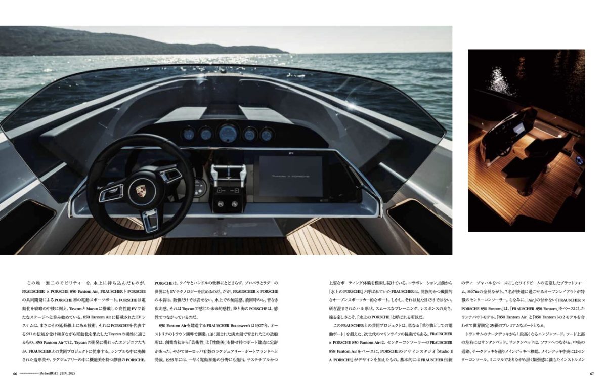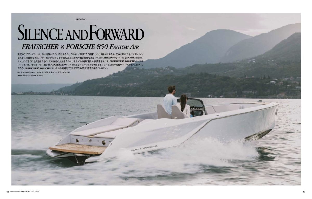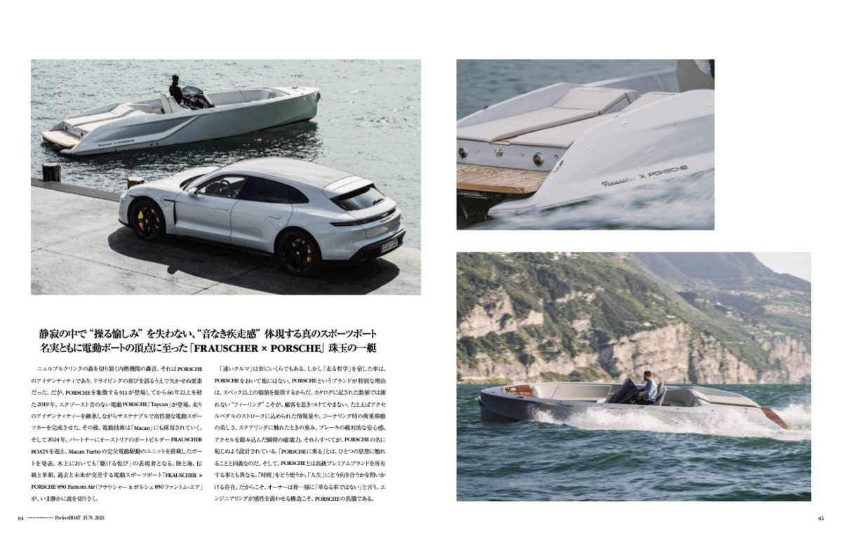だが、FRAUSCHER×PORSCHEの本質は、数値だけでは表せない。水上での加速感、旋回時のG、音なき疾走感。陸と海のPORSCHEは、感性を共有する。PORSCHEは単なるモビリティの電動化にとどまらず、「移動の体験」そのものの再設計に挑んでいる。車からボートへとシームレスにつながるPORSCHEブランドの世界観は、“新しいラグジュアリー”の在り方を示している。