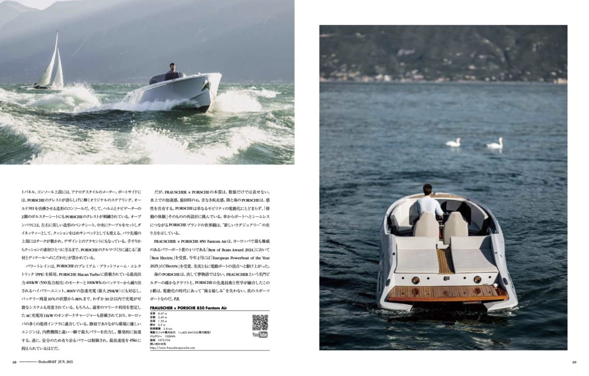 FRAUSCHER×PORSCHE 850 FantomAirは、ヨーロッパで最も権威のあるパワーボート賞の1つである「Best of Boats Award 2024」において「BestElectric」を受賞。今年2月には「European Power boat of the Year 2025」の「Electric」を受賞。名実ともに電動ボートの頂点へと駆け上がった。海のPORSCHEは、決して夢物語ではない。FRAUSCHERという名門ビルダーの確かなクラフトと、PORSCHEの先進技術と哲学が融合したこの1艇は、電動化の時代にあって“操る愉しみ”を失わない、真のスポーツボートなのだ。P.B.