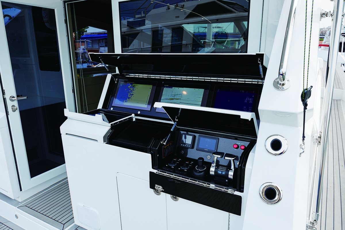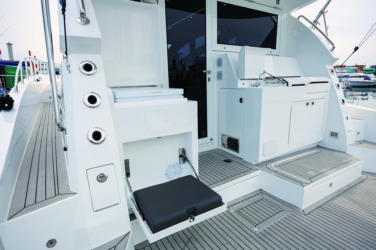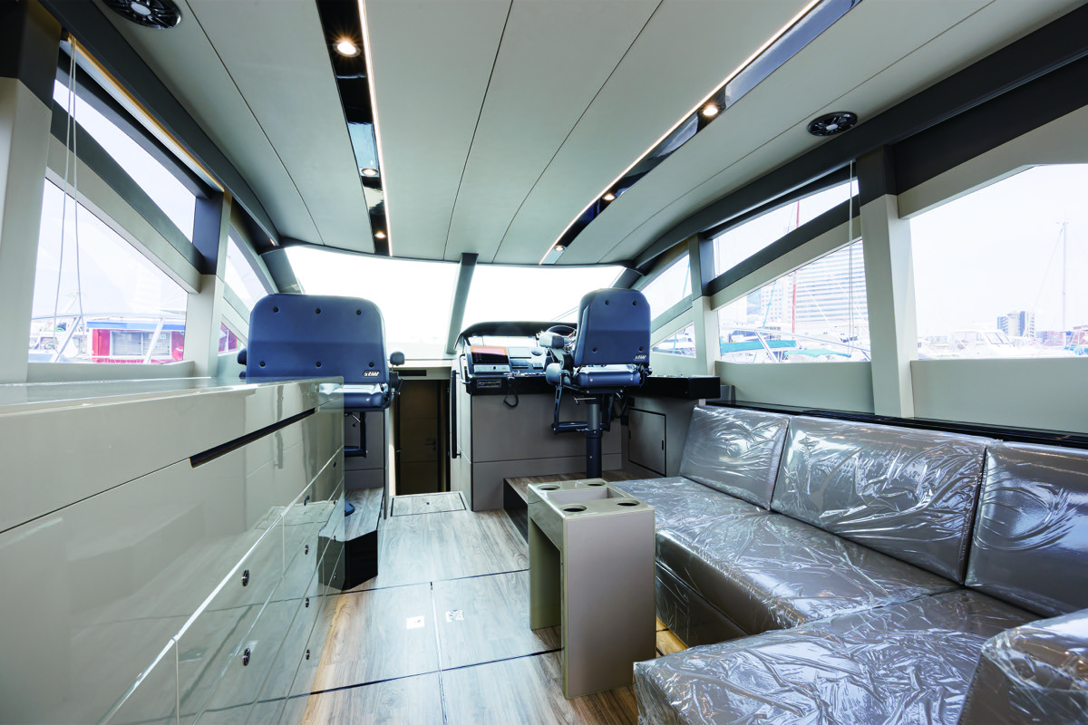 続いて室内を見ていこう。パイロットハウス後部のドアを開けるとまずメインサロンとなる。サロン右舷にはソファと簡易テーブル、左舷には大型ロッカー、最前部左右にそれぞれ独立したパッセジャーズシートとドライバーズシートとが並ぶ。右舷側にメインのヘルムステーション。シートの間にロアフロアへ通じるアクセスステップが来る。特にオーナーのこだわりを感じられるのが、左舷の大型ロッカーだ。ロッド類の収納および各種タックル類の収納スペースとなっているのだが、リールやルアーなどのサイズに合わせ、まるで和箪笥のような工夫がなされている。文字通り圧巻のこだわりの大型ロッカーだ。ドライバーズシートとパッセジャーズシートはSTIDD製、ヘルムステーション周りは2面の大型ディスプレイの他、VOLVOなどの各種計器類が並び、ISOTTA製ステアリングホイールを搭載。またセカンドステーションなども含めてZFSmartCommandSystemを採用しており、油圧式のバウ&スターンスラスター(SIDE POWER Hydraulicbow & Sternthruster)と連動している。またトリムタブはVOLVO Auto Trim Tabだ。