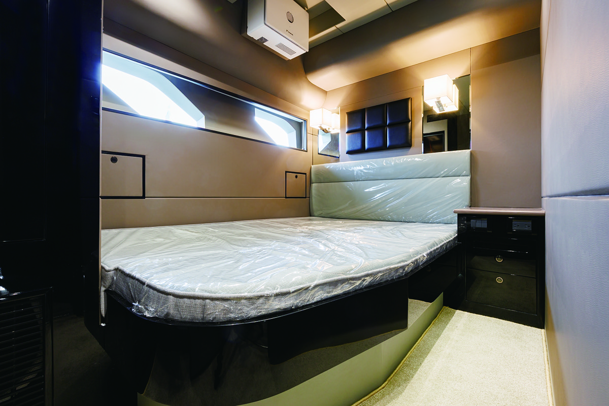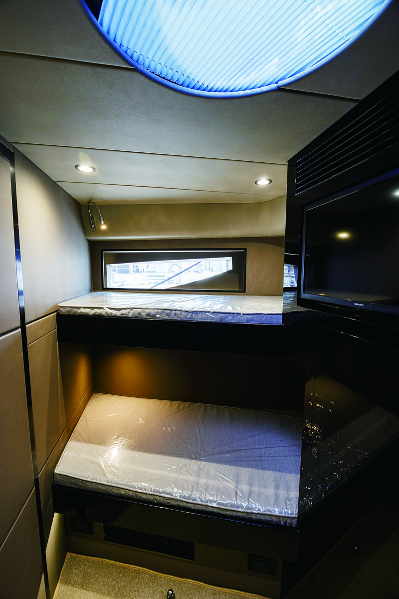 ロアフロアへ下りると左に広々したダウンギャレーがある。ここにはコリアン製カウンタートップを中心にシンク・家庭用冷蔵庫・IHクッキングヒーター・電子レンジなどを配置。その前部に独立したシャワールームが来る。また最前部のフォアキャビンは左舷に上下2段のシングルベッドを配置、右舷側に独立したヘッドルームを擁する。ロアフロアの右舷側はマスターステートルームとなっており、右舷側に寄せた配置のダブルベッド、ストレージなどがあり、前寄りには個室ヘッドルームが備わっている。サロン、2キャビンという構成は50ft艇としてはかなり贅沢な作り。しかもそれぞれにヘッドルームを設け、共通の個室シャワールームまで備わる。こういったキャビン数へのこだわりも自分の用途をはっきりと意識しているオーナーによるカスタマイズならではと言えるだろう。