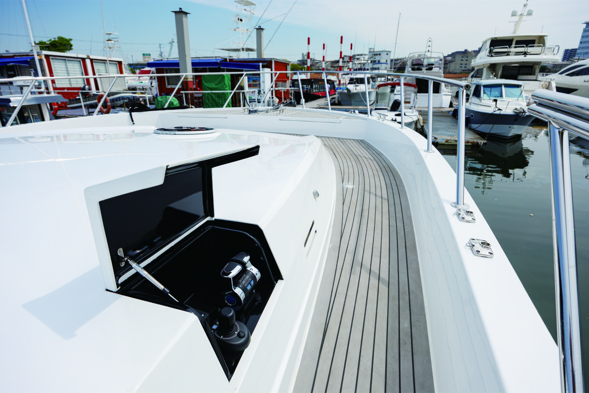 デッキレイアウトは、ウォークアラウンド・センターキャビン(パイロットハウス)の構成でFBの無いハードトップ仕様。ハードトップ上にはレーダー・アンテナの他、独特の形状をしたマストを、さらに両舷には大型LEDライトを配置。アウトリガーも取り付けられている。バウフレアの広がりが特徴的でフォアデッキはかなり広々としている。最前部にアンカーロッカーがあり全体をバウレールが囲う。またアフトも含めデッキ面全体とコーミングトップはグレー&ブラック仕様のプラスチック製チークとなっている。アフトデッキは深めのブルワーク囲まれ中央にはファイティングチェアをセット。オーナーはフィッシングに特化した利用を考えて今回のJACKをオーダーしており、かなり細かな点までこだわっている。たとえばステーションの位置と数。サロン内前部にヘルムステーション、パイロットハウス後部右舷にセカンドステーション(ここのデザインもオーナー自ら行ったそうだ)が配置されているのは一般的だが、このJACKにはもう2つ簡易ステーションが設置されている。1つはフォアデッキの右舷のパイロットハウス側、ちょうどサイドデッキとの境目辺りに、もう1つはアフトデッキ右舷ブルワークに埋め込まれている。前者のステーションは目の前のバウレールも開放でき、ブルワークトップにはロッドホルダー用のマウントも設置されている。フォアデッキの高さ的にも離着岸時の利用というより、ボトムフィッシングなどで使うことが前提だろう。後者も同様でこちらもフィッシングでの利用を、すなわち文字通り「手前船頭」で釣りが愉しめてしまう工夫がなされている。どちらの簡易ステーションもシフトレバーとジョイスティックが装備されている。さらにアフトデッキには海水循環タイプのイケスが合計3箇所に配置されている。またセカンドステーションのあるボックスにはシンク、冷凍庫、製氷機なども備える。