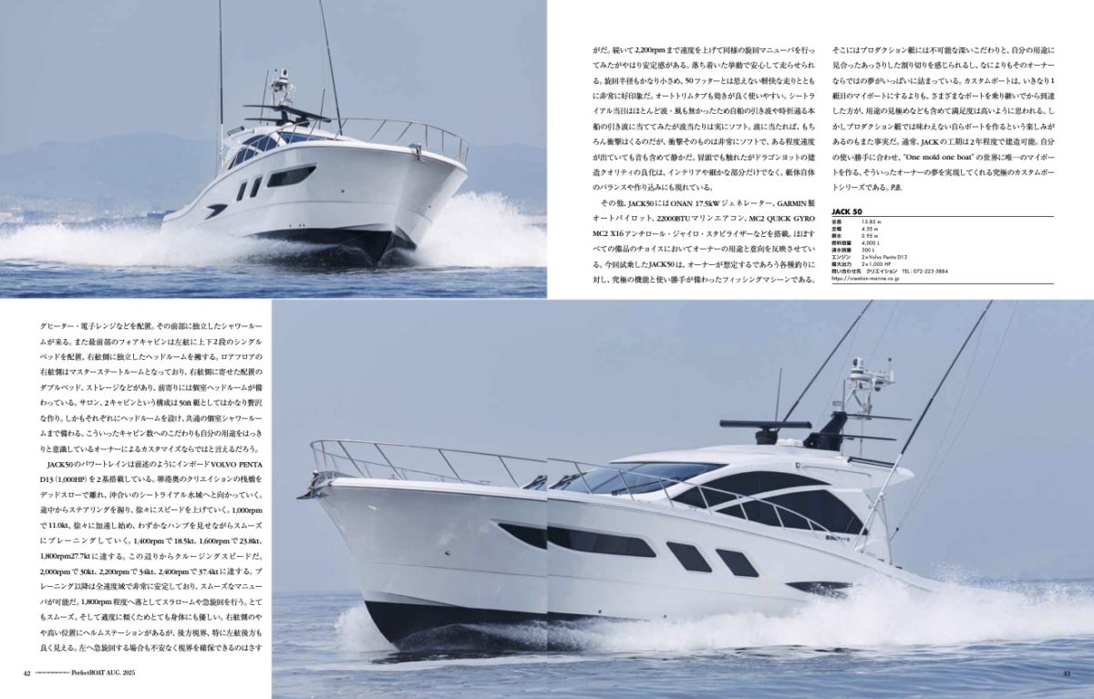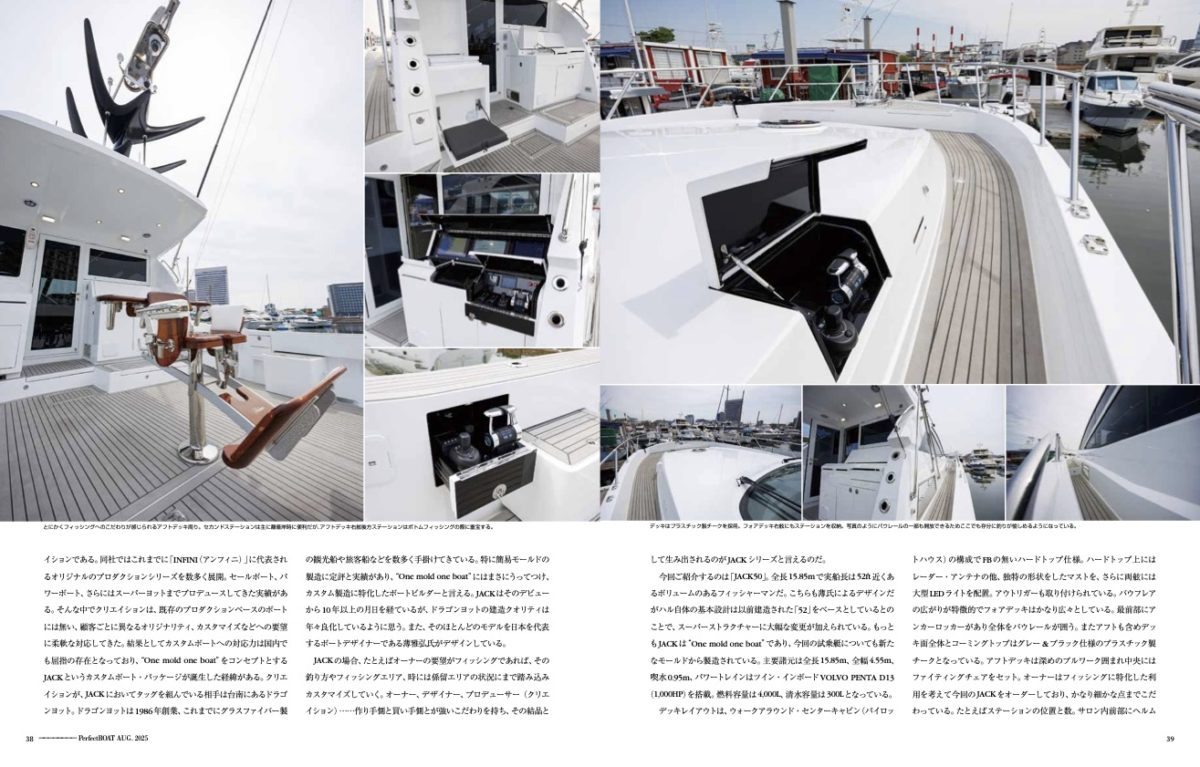 その他、JACK50にはONAN17.5kWジェネレーター、GARMIN製オートパイロット、22000BTUマリンエアコン、MC2 QUICK GYRO MC2X16アンチロール・ジャイロ・スタビライザーなどを搭載。ほぼすべての備品のチョイスにおいてオーナーの用途と意向を反映させている。今回試乗したJACK50は、オーナーが想定するであろう各種釣りに対し、究極の機能と使い勝手が備わったフィッシングマシーンである。そこにはプロダクション艇には不可能な深いこだわりと、自分の用途に見合ったあっさりした割り切りを感じられるし、なによりもそのオーナーならではの夢がいっぱいに詰まっている。カスタムボートは、いきなり1艇目のマイボートにするよりも、さまざまなボートを乗り継いでから到達した方が、用途の見極めなども含めて満足度は高いように思われる。しかしプロダクション艇では味わえない自らボートを作るという楽しみがあるのもまた事実だ。通常、JACKの工期は2年程度で建造可能。自分の使い勝手に合わせ、“Onemoldoneboat”の世界に唯一のマイボートを作る、そういったオーナーの夢を実現してくれる究極のカスタムボー