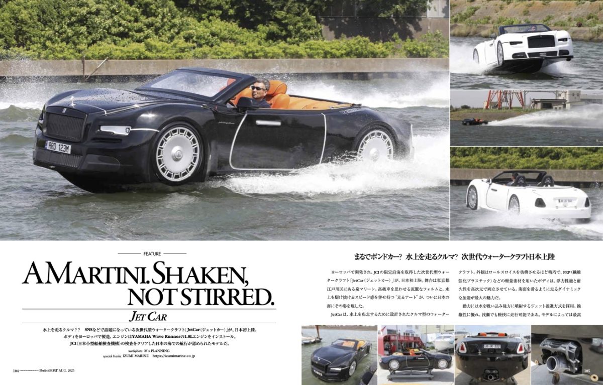 ヨーロッパで開発され、JCIの限定沿海を取得した次世代型ウォータークラフト「JetCa(rジェットカー)」が、日本初上陸。舞台は東京都江戸川区にある泉マリーン。高級車を思わせる流麗なフォルムと、水上を駆け抜けるスピード感を併せ持つ“走るアート”が、ついに日本の海にその姿を現した。