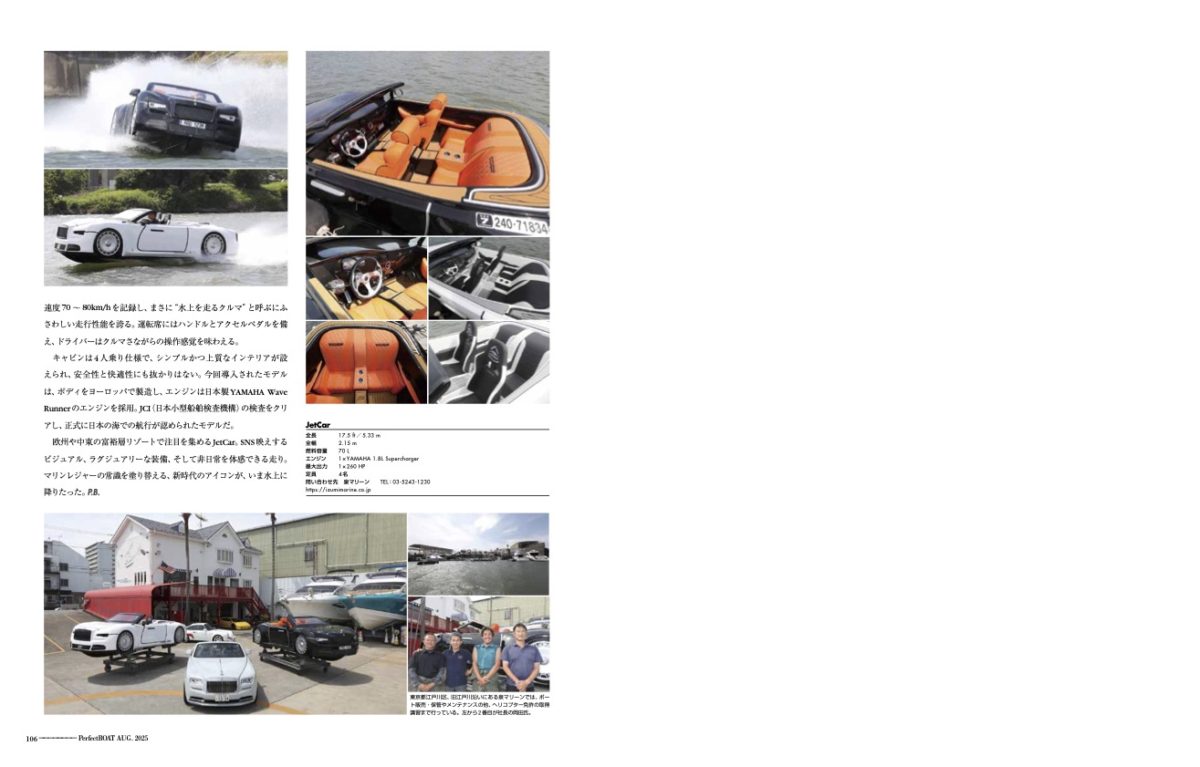 欧州や中東の富裕層リゾートで注目を集めるJetCar。SNS映えするビジュアル、ラグジュアリーな装備、そして非日常を体感できる走り。マリンレジャーの常識を塗り替える、新時代のアイコンが、いま水上に降りたった。P.B.