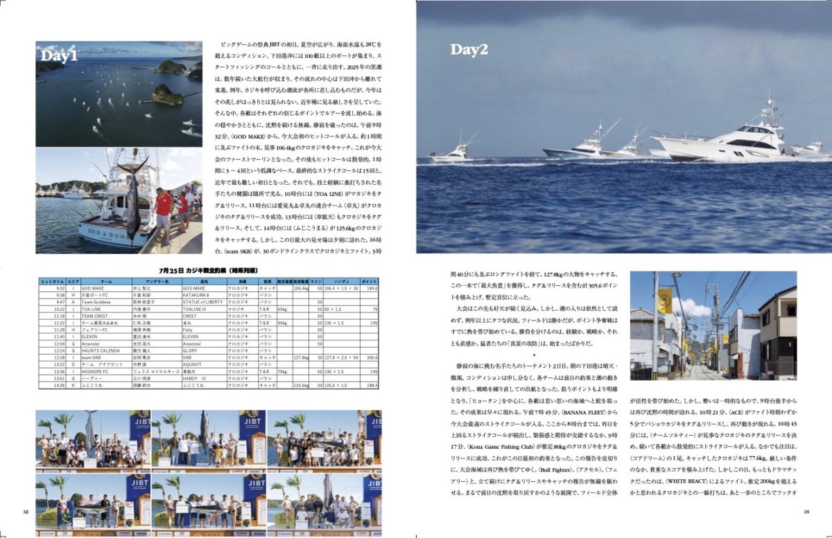 ビッグゲームの祭典JIBTの初日。夏空が広がり、海面水温も28°Cを超えるコンディション。下田港沖には100艇以上のボートが集まり、スタートフィッシングのコールとともに、一斉に走り出す。2025年の黒潮は、数年続いた大蛇行が収まり、その流れの中心は下田沖から離れて東進。例年、カジキを呼び込む潮流が各所に差し込むものだが、今年はその兆しがはっきりとは見られない。近年稀に見る厳しさを呈していた。そんな中、各艇はそれぞれの信じるポイントでルアーを流し始める。海の穏やかさとともに、沈黙を続ける無線。静寂を破ったのは、午前9時32分。〈GODMAKE〉から、今大会初のヒットコールが入る。約1時間に及ぶファイトの末、見事106.4kgのクロカジキをキャッチ。これが今大会のファーストマーリンとなった。その後もヒットコールは散発的。1時間に3~4回という低調なペース。最終的なストライクコールは15回と、近年で最も難しい初日となった。それでも、技と経験に裏打ちされた名手たちの健闘は随所で光る。10時台には〈TOALINE〉がマカジキをタグ&リリース、11時台には愛晃丸&卓丸の連合チーム〈卓丸〉がクロカジキのタグ&リリースを成功。13時台には〈韋駄天〉もクロカジキをタグ&リリース。そして、14時台には〈ふじこうまる〉が125.6kgのクロカジキをキャッチする。しかし、この日最大の見せ場は夕刻に訪れた。16時台、〈teamSKB〉が、30ポンドラインクラスでクロカジキとファイト。3時間40分にも及ぶロングファイトを経て、127.8kgの大物をキャッチする。この一本で「最大魚賞」を獲得し、タグ&リリースを含む計305.6ポイントを積み上げ、暫定首位に立った。