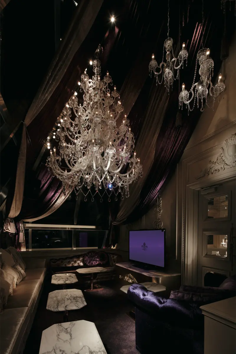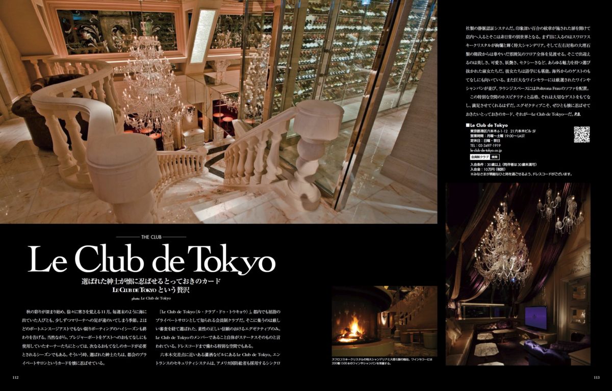 六本木交差点に近いある瀟洒なビルにあるLe Club de Tokyo。エントランスのセキュリティシステムは、アメリカ国防総省も採用するシンクロ社製の静脈認証システムだ。印象深い百合の紋章が施された扉を開けて店内へ入るとそこは非日常の別世界となる。まず目に入るのはスワロフスキークリスタルが絢爛と輝く特大シャンデリア。そして左右対称の大理石製の階段からは華やいだ雰囲気のフロア全体を見渡せる。そこで出迎えるのは美しさ、可愛さ、妖艶さ、セクシーさなど、あらゆる魅力を持つ選び抜かれた淑女たちだ。彼女たちは語学にも堪能。海外からのゲストのもてなしにも向いている。また巨大なワインセラーには厳選されたワインやシャンパンが並び、ラウンジスペースにはPoltrona Frauのソファを配置。