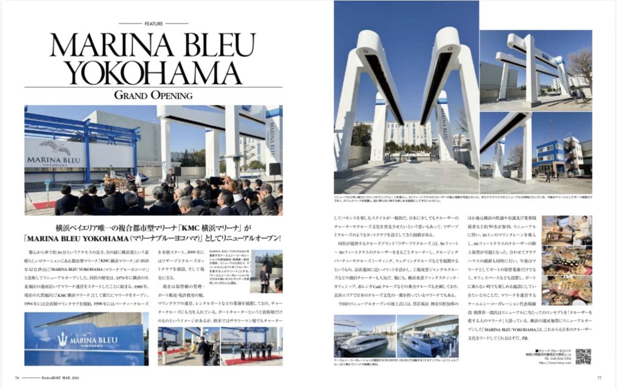 同社が提供するクルーズブランド「リザーブドクルーズ」は、50フィート~90フィートクラスのクルーザーをまるごとチャーターし、クルージングパーティーやクルーズミーティング、ウェディングクルーズなどを展開するというもの。京浜運河に近いメリットを活かし、工場夜景ジャングルクルーズなどの独自チャーターも人気だ。他にも、横浜夜景ファンタスティック・カフェシップ、赤レンガCaféクルーズなどの乗合クルーズも企画しており、京浜エリアで日本のクルーズ文化の一翼を担っているマリーナでもある。今回のリニューアルオープンの竣工式には、黒岩祐治神奈川県知事のほか地元横浜の県議や市議及び業界関係者など約50名が参列。リニューアルに伴い、30トンのマリンクレーンを導入し、60フィートクラスのクルーザーの陸上保管が可能となった。合わせてクラブハウスの刷新も同時に行い、今後はマリーナとしてボートの保管業務だけでなく、カフェスペースなども設置し、ボートに乗らない時でも楽しめる施設にしていきたいとのことだ。マリーナを運営するケーエムシーコーポレーション代表取締役熊澤喜一郎氏はリニューアルに当たってのコンセプトを「クルーザーを愛する人のマリーナ」と語っている。横浜の運河地帯にリニューアルオープンした「MARINABLEUYOKOHAMA」は、これからも日本のクルーザー文化をリードしてくれるはずだ。P.B.