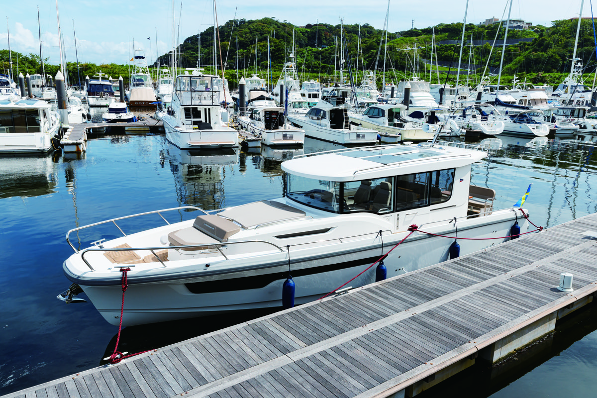 シティマリーナヴェラシスの桟橋に係留された日本初上陸の「NIMBUS C11(ニンバスC11)」。呼称は11(37フィート)だが、実際の全長は12.4mで40フィートを超える。真横から見る姿は、トレンドの、新しいスタイリングのフィンランドボートにも似ている。その特徴は、パフォーマンスボートのような細身のステップドハルに、スピードとスタビリティを両立するダブルチャイン。ロングノーズのバウデッキとショートデッキのスポーティなスタイリング。水線長を伸ばす直立に近いバウステムに、低めで直線的なシアーライン。直立したフロントウィンドシールドのスクエアなキャビンに、機能的な両側スライドドア。デッキレイアウトは日本で人気の高いウォークアラウンド。エンジンはアフトデッキの下、トランサムステップの下にアウトドライブが隠れるスターンドライブ。もちろん、世界的に人気の高いアウトボードエンジンを選択することもできる。
