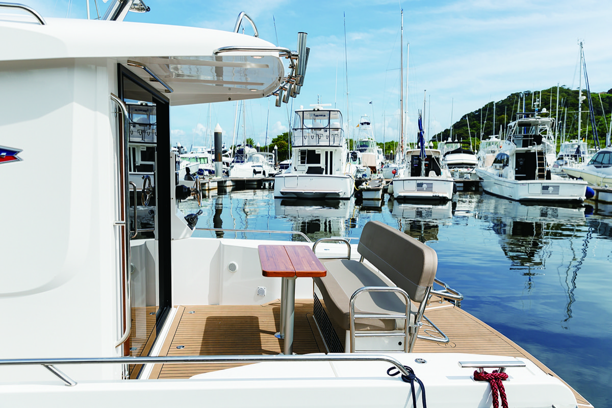 トランサムから1,200mm後方に伸びるワイドなトランサムステップから乗船する。段差のないフラットなオープントランサムスタイルのアフトデッキ。トランサムの位置には、1,550mm幅のソファとチークトップのテーブルが固定されている。ソファ後部に、6本のフェンダーが綺麗に収まるフェンダーホルダーが並ぶエクステリアは北欧伝統の合理的なスタイルだ。