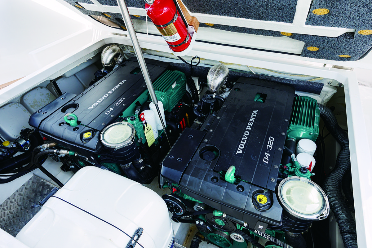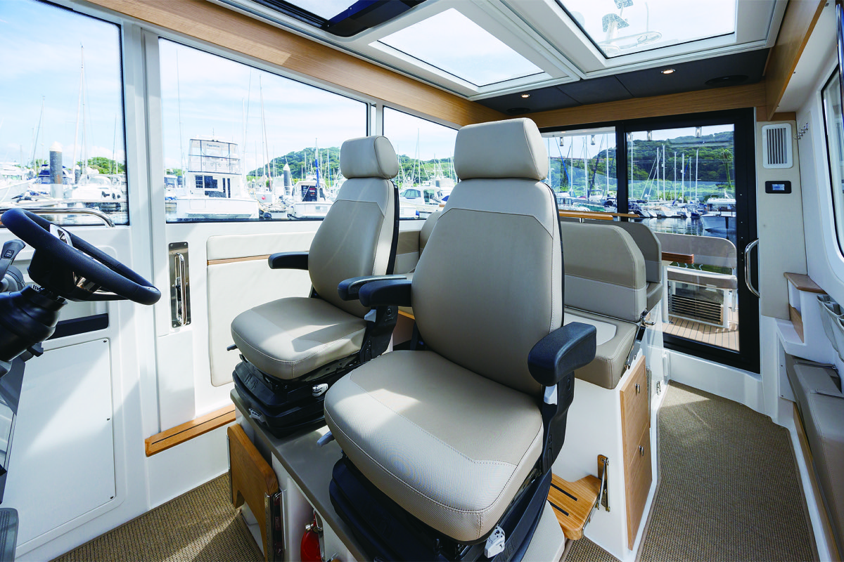 コクピットには、ショックアブソーバーの備わるGRAMMERのパイロットシートが2脚固定されている。ステアリングホイールのチルトを起こし、ジョイスティックで離岸する。VOLVO PENTAのアウトドライブは、IPSと同じ仕組みでジョイスティックコントロールを可能にする。もちろん、真横や斜めに直感で移動できるだけでなく、定点に留まることができるDPS(Dynamicpositioningsystem)も搭載しているので、全長40フィート7インチのC11をシングルハンドでも簡単に操船することができる。