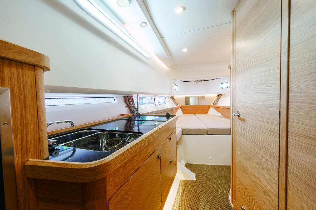 ポートサイドにはギャレー。シンクの他に2口の電気コンロやリフリジェレーターが備わる。その奥には、1,960mmの長さがあるダブルバース。ギャレーの向かい側には、独立したトイレ&シャワーブースのあるヘッドコンパートメント。トイレにはカバーが備わり、ドレッサーと分かれている。水浸しになることなく、シャワー後も快適に使うことができる。ミッドシップには1,980mm×1,220mmのダブルキャビン。ファミリー4人がオーバーナイトできるアコモデーションを備えている。