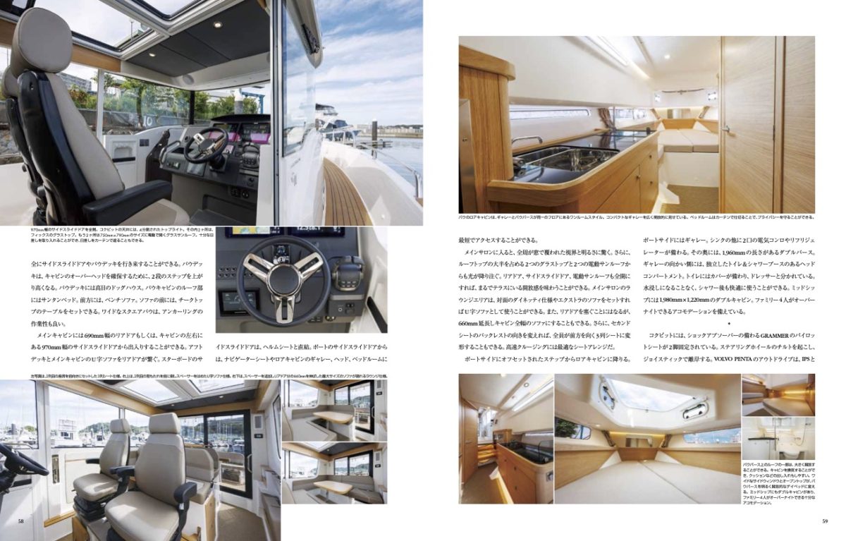 メインキャビンには690mm幅のリアドアもしくは、キャビンの左右にある970mm幅のサイドスライドドアから出入りすることができる。アフトデッキとメインキャビンのU字ソファをリアドアが繋ぐ。スターボードのサイドスライドドアは、ヘルムシートと直結。ポートのサイドスライドドアからは、ナビゲーターシートやロアキャビンのギャレー、ヘッド、ベッドルームに最短でアクセスすることができる。