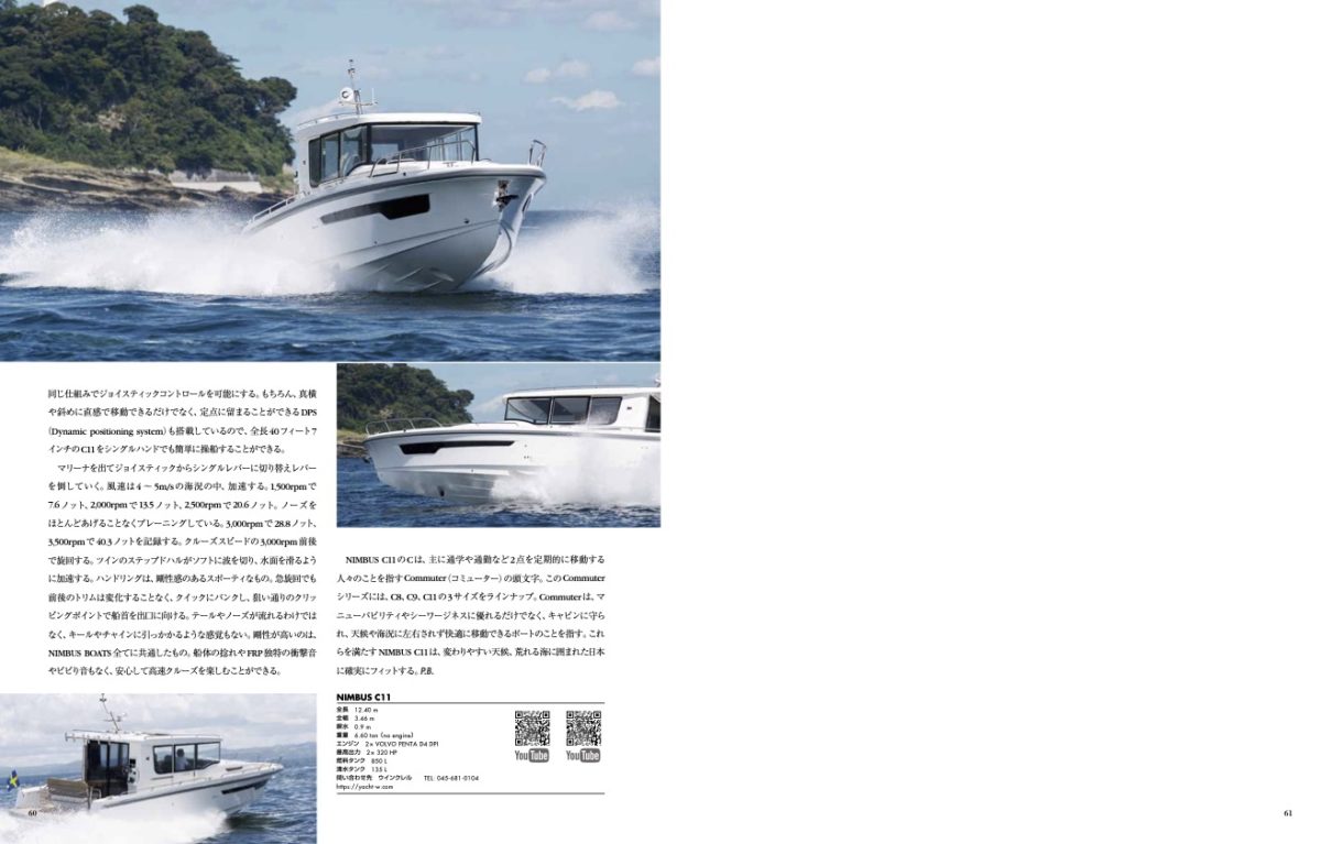 NIMBUS C11のCは、主に通学や通勤など2点を定期的に移動する人々のことを指すCommute(rコミューター)の頭文字。このCommuterシリーズには、C8、C9、C11の3サイズをラインナップ。Commuterは、マニューバビリティやシーワージネスに優れるだけでなく、キャビンに守られ、天候や海況に左右されず快適に移動できるボートのことを指す。これらを満たすNIMBUS C11は、変わりやすい天候、荒れる海に囲まれた日本に確実にフィットする。P.B.