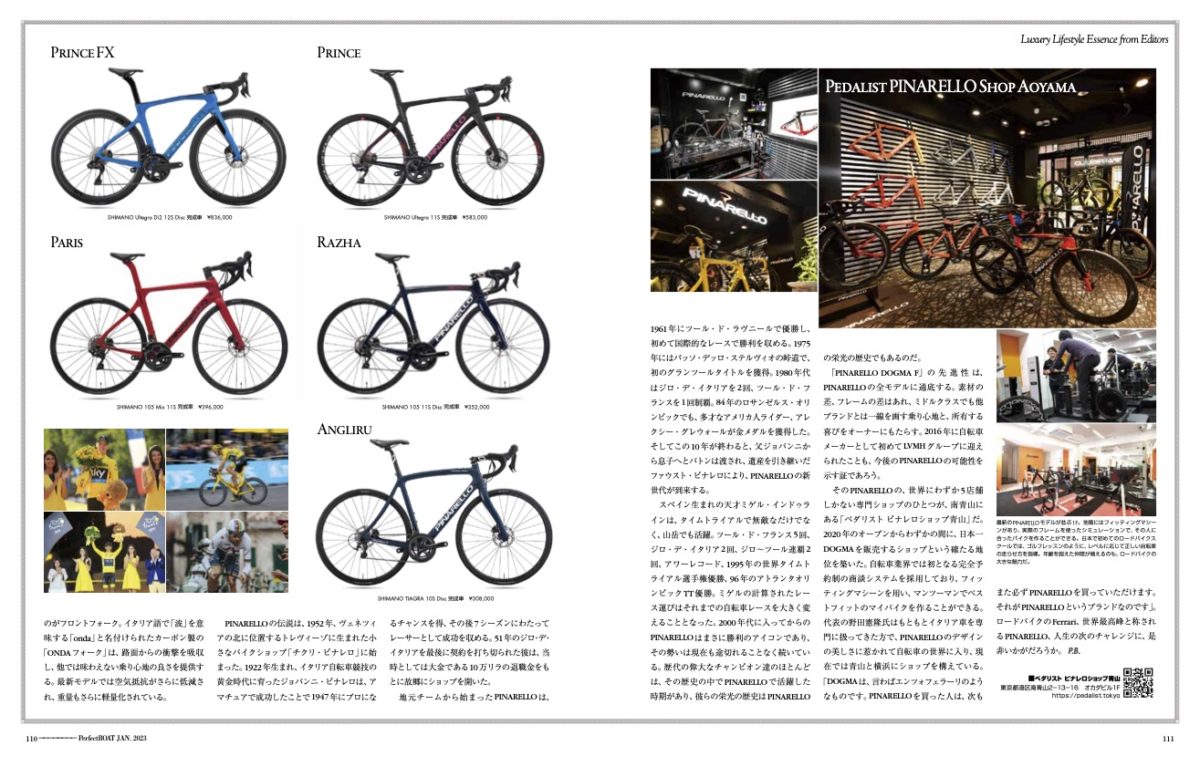 そのPINARELLOの、世界にわずか5店舗しかない専門ショップのひとつが、南青山にある「ペダリストピナレロショップ青山」だ。2020年のオープンからわずかの間に、日本一DOGMAを販売するショップという確たる地位を築いた。自転車業界では初となる完全予約制の商談システムを採用しており、フィッティングマシーンを用い、マンツーマンでベストフィットのマイバイクを作ることができる。代表の野田憲隆氏はもともとイタリア車を専門に扱ってきた方で、PINARELLOのデザインの美しさに惹かれて自転車の世界に入り、現在では青山と横浜にショップを構えている。「DOGMAは、言わばエンツォフェラーリのようなものです。PINARELLOを買った人は、次もまた必ずPINARELLOを買っていただけます。それがPINARELLOというブランドなのです」。ロードバイクのFerrari、世界最高峰と称されるPINARELLO、人生の次のチャレンジに、是非いかがだろうか。P.B.