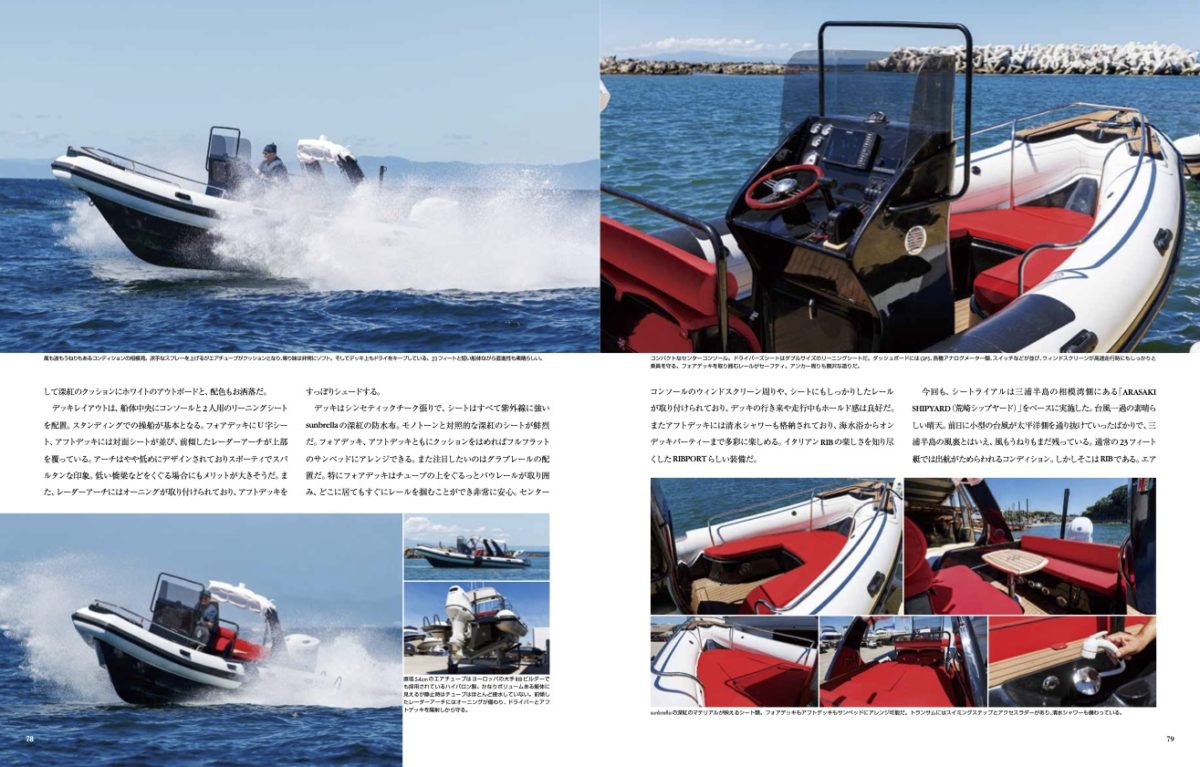 「RIBPORTRIB-Z23L(リブポート・リブZ23L)」は、日本でプロデュースされた23フィートのRIB(リジッド・インフレータブル・ボート)。艇体は、FRPのハードボトムに、ヨーロッパの大手RIBビルダーなどでも採用されているハイパロンを使ったエアチューブが舷側を覆う。全長7.00m、全幅2.72m、全深0.98m、23フィートとはいえ陸上で見るとかなりのボリューム感がある。チューブ径は0.54m、気室数は5つ。艇体重量は780kgで、推奨出力は90~200馬力。今回の艇には、4ストローク2.8リッター直列4気筒のアウトボードSUZUKIDF200Aがインストールされている。ブラックのFRP部分とオフホワイトのチューブ、その中央にアクセントになるブラックのラブレール、ブラックのセンターコンソールとレーダーアーチ、そして深紅のクッションにホワイトのアウトボードと、配色もお洒落だ。