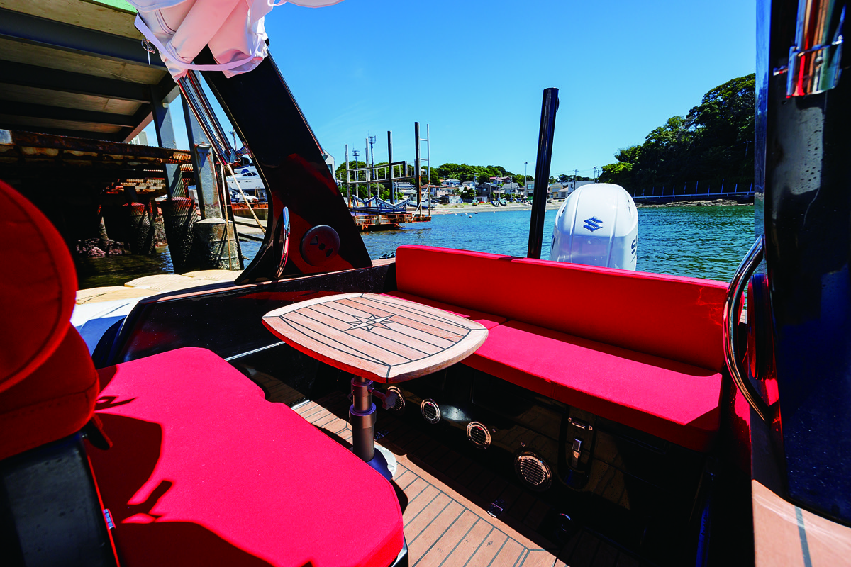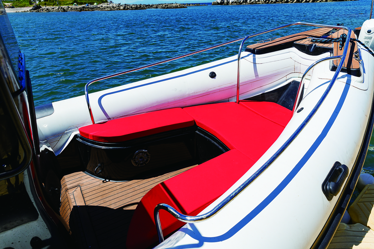 デッキはシンセティックチーク張りで、シートはすべて紫外線に強いsunbrellaの深紅の防水布。モノトーンと対照的な深紅のシートが鮮烈だ。フォアデッキ、アフトデッキともにクッションをはめればフルフラットのサンベッドにアレンジできる。また注目したいのはグラブレールの配置だ。特にフォアデッキはチューブの上をぐるっとバウレールが取り囲み、どこに居てもすぐにレールを掴むことができ非常に安心。センターコンソールのウィンドスクリーン周りや、シートにもしっかりしたレールが取り付けられており、デッキの行き来や走行中もホールド感は良好だ。またアフトデッキには清水シャワーも格納されており、海水浴からオンデッキパーティーまで多彩に楽しめる。イタリアンRIBの楽しさを知り尽くしたRIBPORTらしい装備だ。