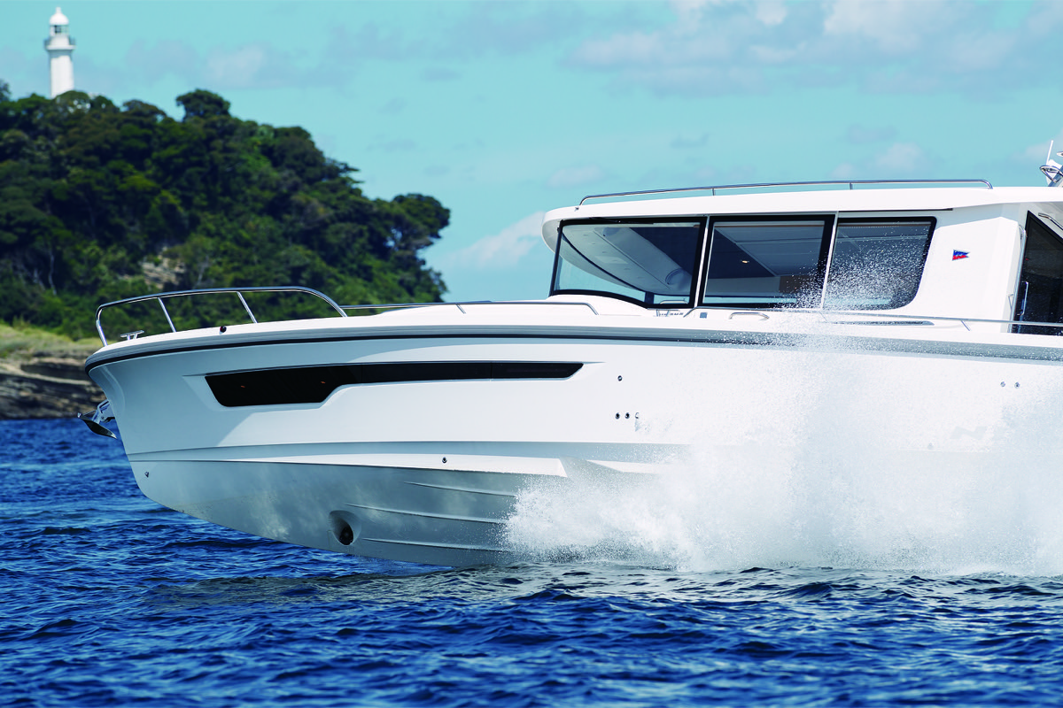ト、アフトデッキには対面シートが並び、前傾したレーダーアーチが上部を覆っている。アーチはやや低めにデザインされておりスポーティでスパルタンな印象。低い橋梁などをくぐる場合にもメリットが大きそうだ。また、レーダーアーチにはオーニングが取り付けられており、アフトデッキをすっぽりシェードする。