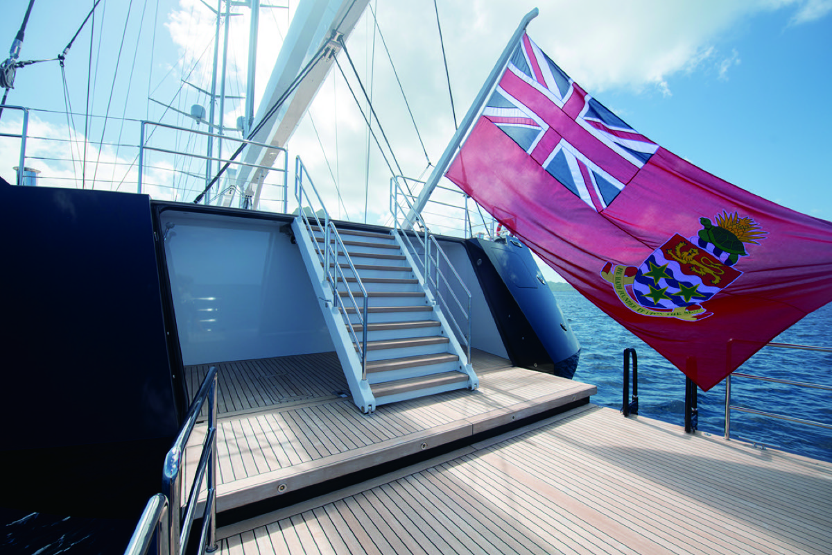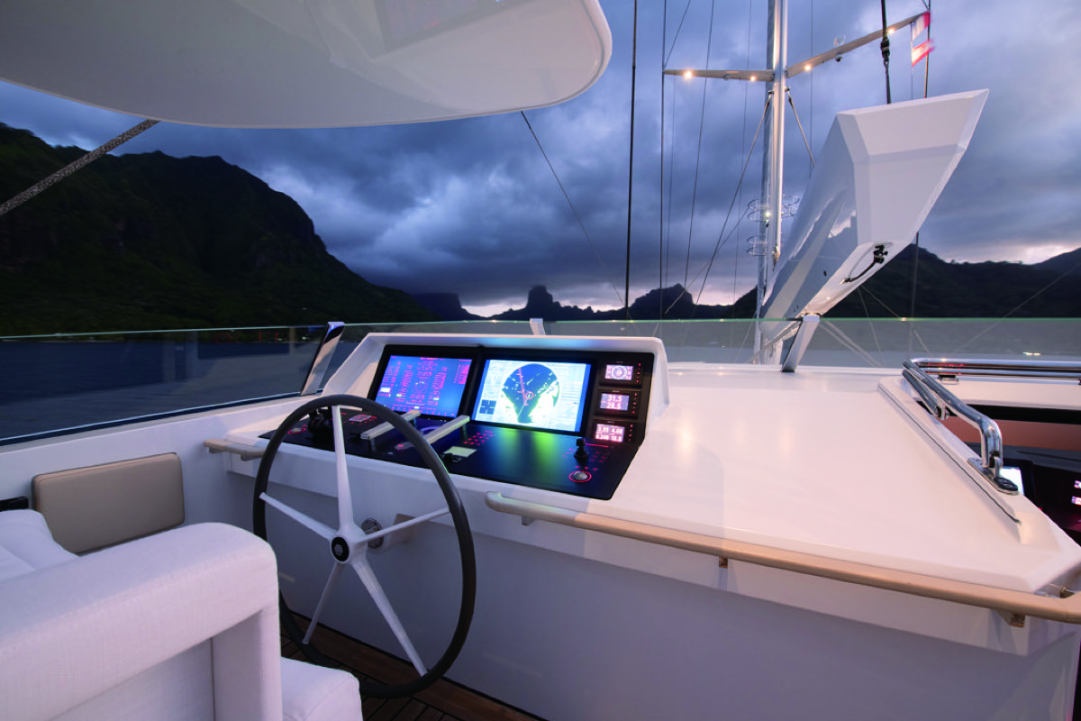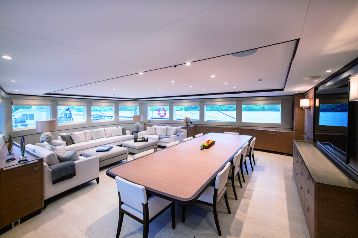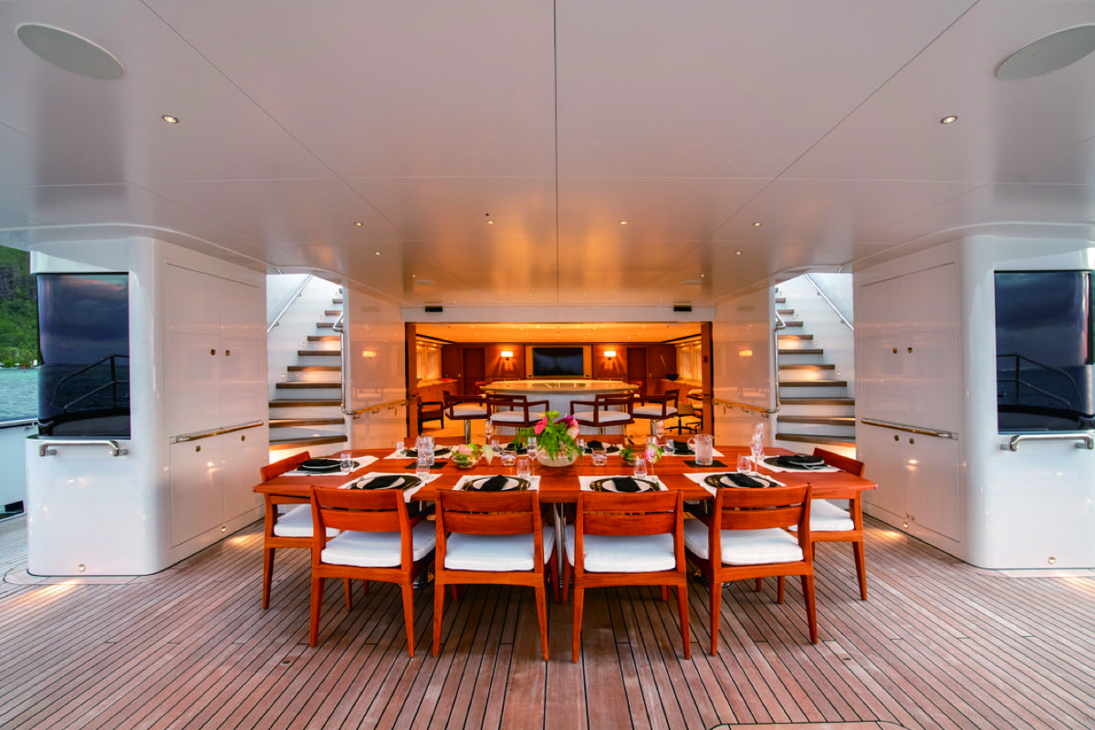 デッキサロンとエクステリアデッキはスライド式のガラスパネルで仕切られており、開け放すとインテリアとエクステリアは美しく融合し、内側から外側まで一続きの空間となる。サロンの左右にある階段は広大なフライブリッジに通じ、ここでは360度の眺望を楽しみ、航海の様子を観察することができる。メインマストと後尾のミズンマストの間には、セカンダリーラウンジとフォーマルダイニングがあり、最大16名のゲストが着席可能だ。