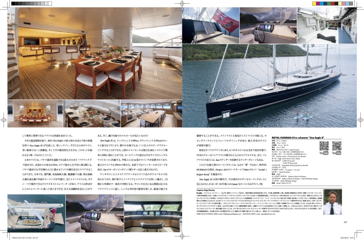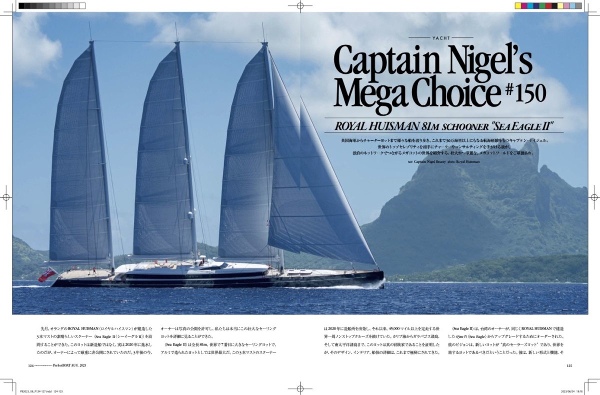 先月、オランダのROYAL HUISMAN(ロイヤルハイスマン)が建造した3本マストの素晴らしいスクーナー〈SeaEagleI(IシーイーグルII)〉を訪問することができた。このヨットは新造船ではなく、実は2020年に進水したのだが、オーナーによって厳重に非公開にされていたのだ。3年後の今、オーナーは写真の公開を許可し、私たちは本当にこの壮大なセーリングヨットを詳細に見ることができた。