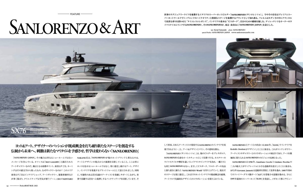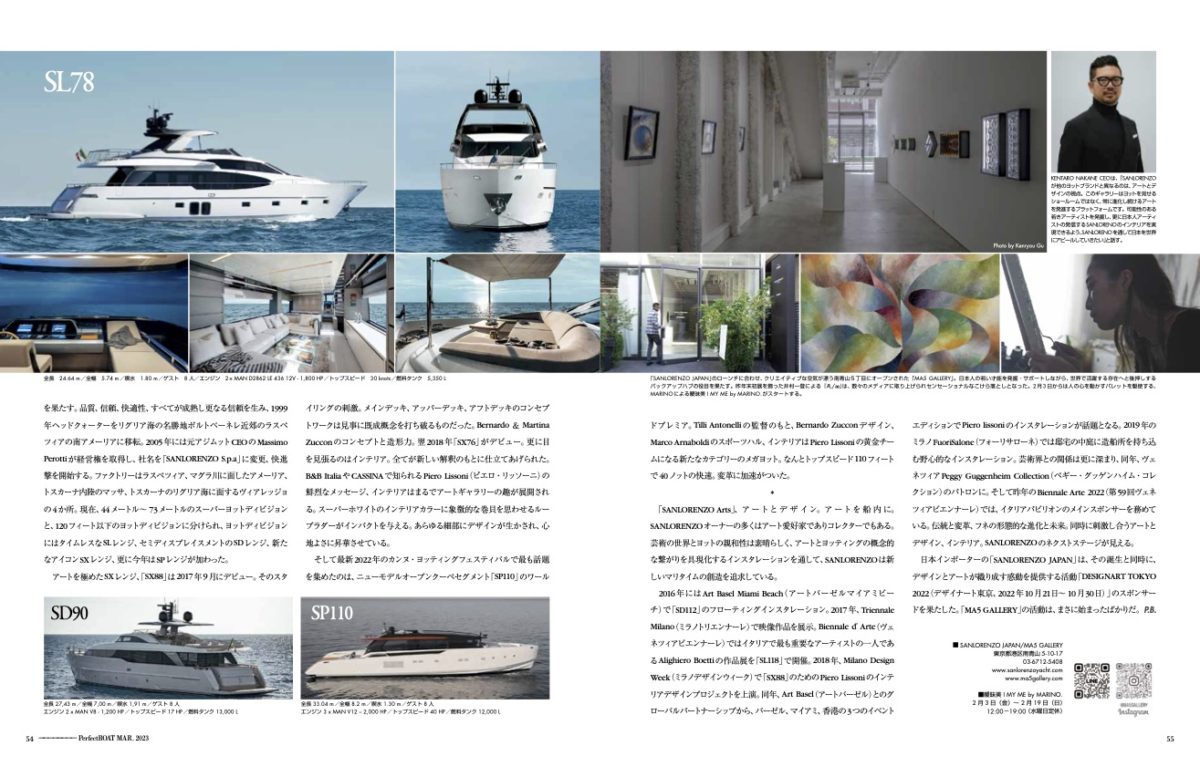 日本インポーターの「SANLORENZO JAPAN」は、その誕生と同時に、デザインとアートが織り成す感動を提供する活動「DESIGN ART TOKYO 2022(デザイナート東京、2022年10月21日~10月30日)」のスポンサードを果たした。「MA5 GALLERY」の活動は、まさに始まったばかりだ。P.B.