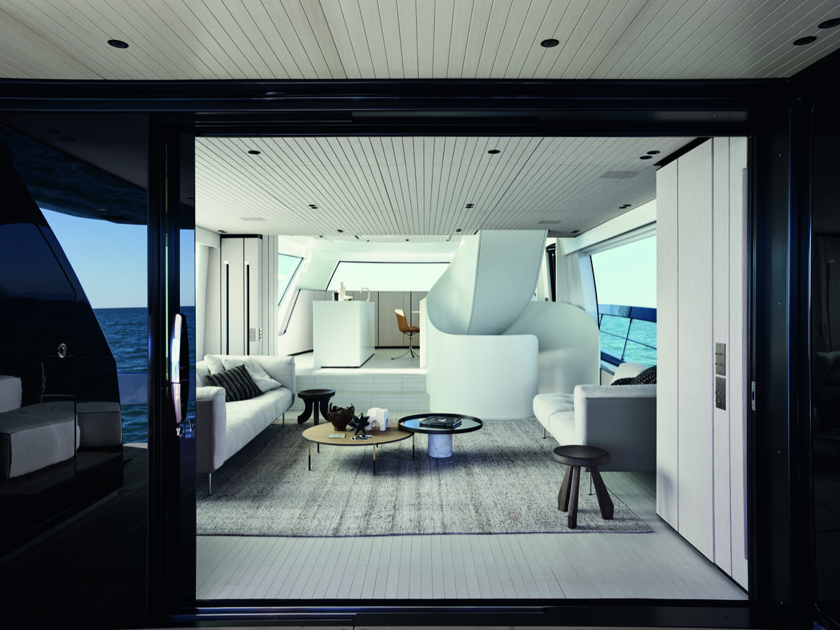アートを極めたSXレンジ、「SX88」は2017年9月にデビュー。そのスタイリングの刺激。メインデッキ、アッパーデッキ、アフトデッキのコンセプトワークは見事に既成概念を打ち破るものだった。Bernardo&Martina Zucconのコンセプトと造形力。翌2018年「SX76」がデビュー。更に目を見張るのはインテリア。全てが新しい解釈のもとに仕立てあげられた。B&BItaliaやCASSINAで知られるPieroLisson(iピエロ・リッソーニ)の鮮烈なメッセージ、インテリアはまるでアートギャラリーの趣が展開される。スーパーホワイトのインテリアカラーに象徴的な巻貝を思わせるループラダーがインパクトを与える。あらゆる細部にデザインが生かされ、心地よさに昇華させている。