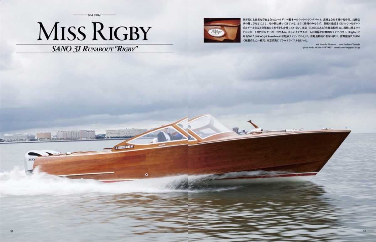 〈Rigby〉と命名された「SANO 31 Runabout(佐野31ランナバウト)」は、全長9.50m、全幅3.20m、重量4ton、ホンジュラスマホガニーを多用した実に美しいランナバウトである。パワートレインにはツインアウトボードHONDA BF250 Dを搭載。レイアウトは、クローズドバウ(キャビン)仕様のオーソドックスなスタイルのオープンボートだ。