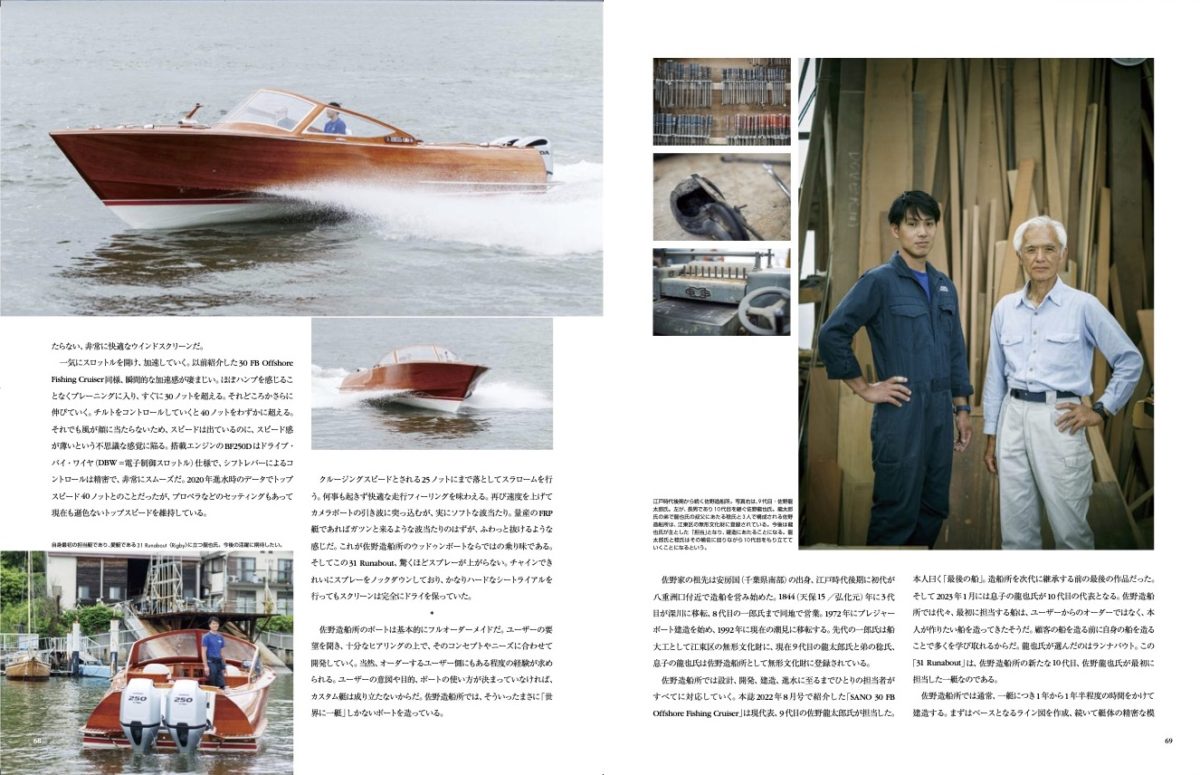 本人曰く「最後の船」。造船所を次代に継承する前の最後の作品だった。そして2023年1月には息子の龍也氏が10代目の代表となる。佐野造船所では代々、最初に担当する船は、ユーザーからのオーダーではなく、本人が作りたい船を造ってきたそうだ。顧客の船を造る前に自身の船を造ることで多くを学び取れるからだ。龍也氏が選んだのはランナバウト。この「31 Runabout」は、佐野造船所の新たな10代目、佐野龍也氏が最初に担当した一艇なのである。