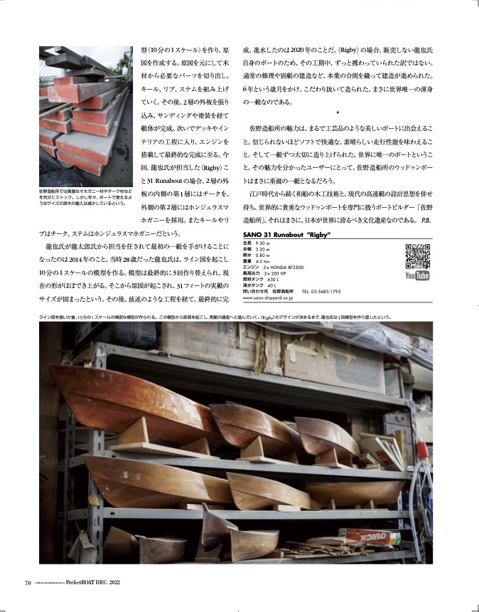 江戸時代から続く和船の木工技術と、現代の高速艇の設計思想を併せ持ち、世界的に貴重なウッドゥンボートを専門に扱うボートビルダー「佐野造船所」。それはまさに、日本が世界に誇るべき文化遺産なのである。P.B.