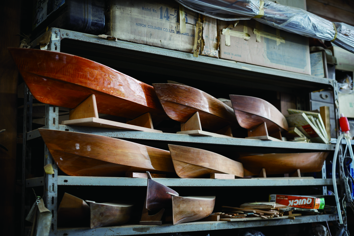 龍也氏が龍太郎氏から担当を任されて最初の一艇を手がけることになったのは2014年のこと。当時28歳だった龍也氏は、ライン図を起こし10分の1スケールの模型を作る。模型は最終的に3回作り替えられ、現在の形がほぼでき上がる。そこから原図が起こされ、31フィートの実艇のサイズが固まったという。その後、前述のような工程を経て、最終的に完成、進水したのは2020年のことだ。〈Rigby〉の場合、販売しない龍也氏自身のボートのため、その工期中、ずっと携わっていられた訳ではない。通常の修理や別艇の建造など、本業の合間を縫って建造が進められた。6年という歳月をかけ、こだわり抜いて造られた、まさに世界唯一の渾身の一艇なのである。