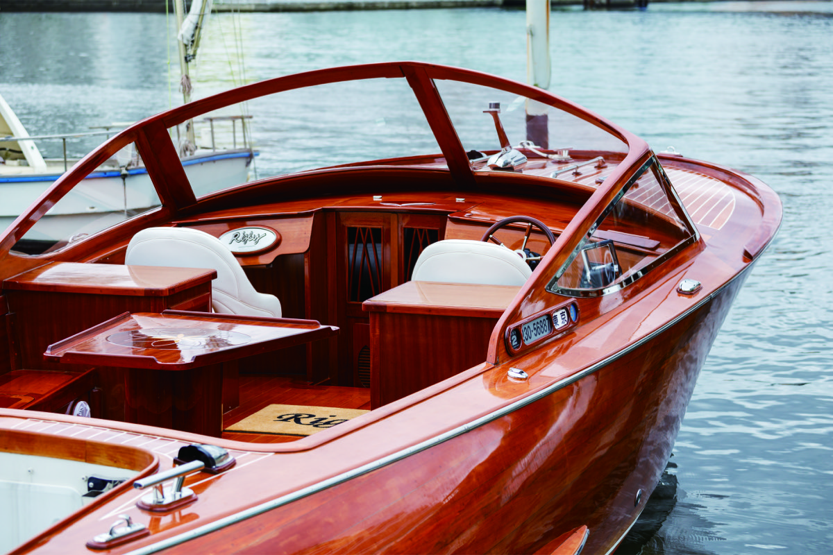 佐野造船所では通常、一艇につき1年から1年半程度の時間をかけて建造する。まずはベースとなるライン図を作成、続いて艇体の精密な模型(10分の1スケール)を作り、原図を作成する。原図を元にして木材から必要なパーツを切り出し、キール、リブ、ステムを組み上げていく。その後、2層の外板を張り込み、サンディングや塗装を経て艇体が完成。次いでデッキやインテリアの工程に入り、エンジンを搭載して最終的な完成に至る。今回、龍也氏が担当した〈Rigby〉こと31 Runaboutの場合、2層の外板の内側の第1層にはチークを、外側の第2層にはホンジュラスマホガニーを採用。またキールやリブはチーク、ステムはホンジュラスマホガニーだという。