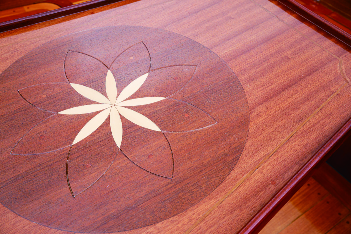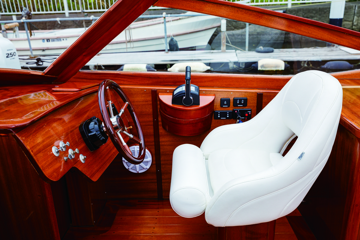 コクピットは右舷前方にドライバーズシート、左舷にパッセンジャーシート、後部に大型のU字ソファとテーブルを配置している。ヘルムステーションにはGPSプロッタやBluetoothオーディオシステムなどを搭載。トランサムのモーターウェルはかなり広くスペースが取られており、ツインアウトボードの両脇に取り付けられたスイミングプラットフォームへのアクセスもしやすい。トランサム付近の舷側は、特徴的なタンブルホームによる大きな勾配があるため、横着けした状態での乗り降りはスイミングプラットフォームからが楽だ。コクピットのデッキ面、ブルワークトップなども全てふんだんにマホガニーを採用。フォアデッキにはマリン合板の上に無垢のマホガニーが張り込まれているが、木目も揃い非常に美しい。デッキ面を見ているだけでもまるで工芸品のような仕上がりだ。
