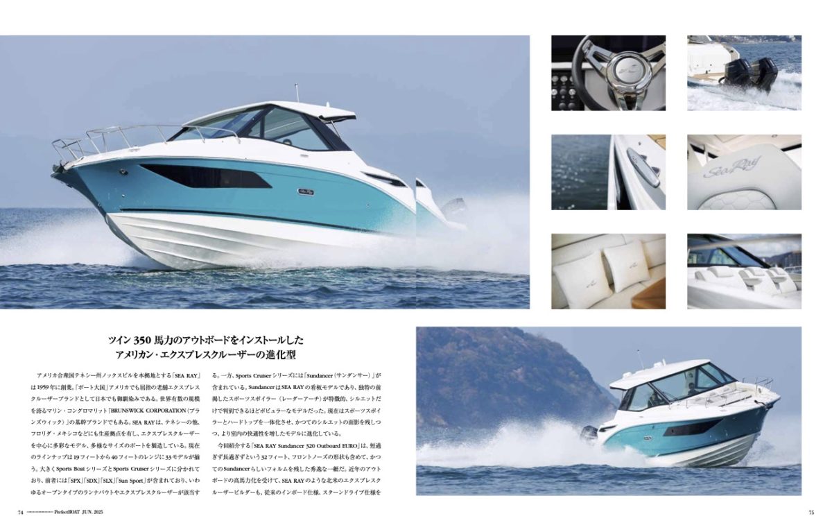 アメリカ合衆国テネシー州ノックスビルを本拠地とする「SEA RAY」は1959年に創業。「ボート大国」アメリカでも屈指の老舗エクスプレスクルーザーブランドとして日本でも御馴染みである。世界有数の規模を誇るマリン・コングロマリット「BRUNSWI CKCORPORATION(ブランズウィック)」の基幹ブランドでもある。SEARAYは、テネシーの他、フロリダ・メキシコなどにも生産拠点を有し、エクスプレスクルーザーを中心に多彩なモデル、多様なサイズのボートを製造している。現在のラインナップは19フィートから40フィートのレンジに33モデルが揃う。大きくSportsBoatシリーズとSportsCruiserシリーズに分かれており、前者には「SPX」「SDX」「SLX」「Sun Sport」が含まれており、いわゆるオープンタイプのランナバウトやエクスプレスクルーザーが該当する。一方、Sports Cruiserシリーズには「Sundance(rサンダンサー)」が含まれている。SundancerはSEA RAYの看板モデルであり、独特の前掲したスポーツスポイラー(レーダーアーチ)が特徴的、シルエットだけで判別できるほどポピュラーなモデルだった。現在はスポーツスポイラーとハードトップを一体化させ、かつてのシルエットの面影を残しつつ、より室内の快適性を増したモデルに進化している。